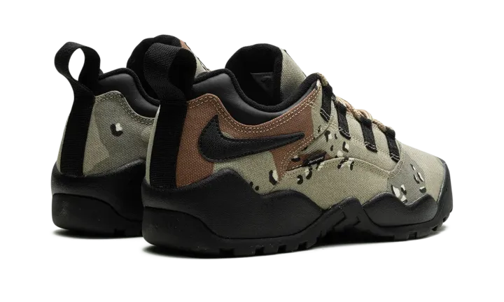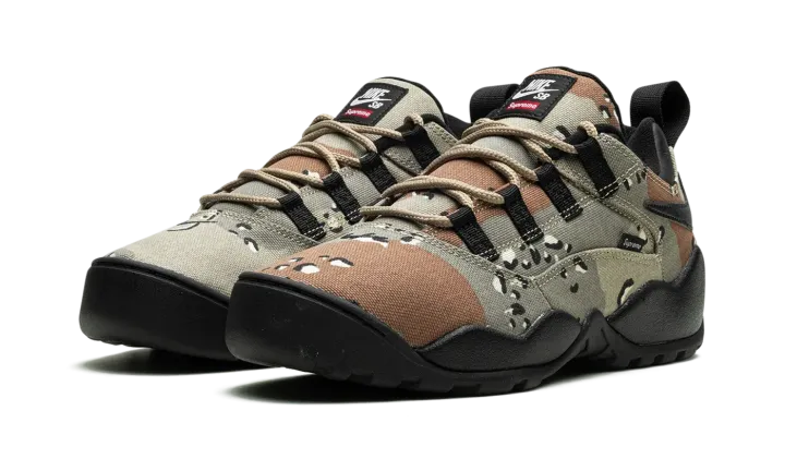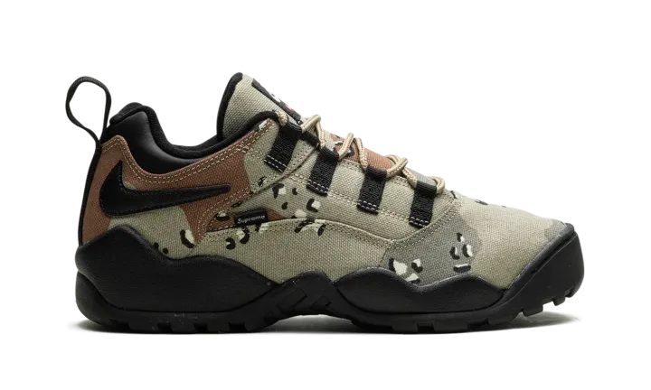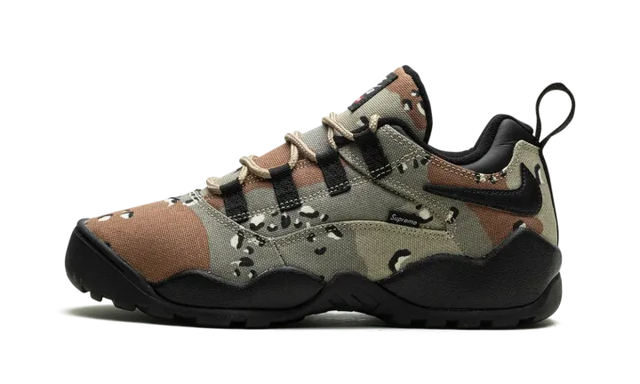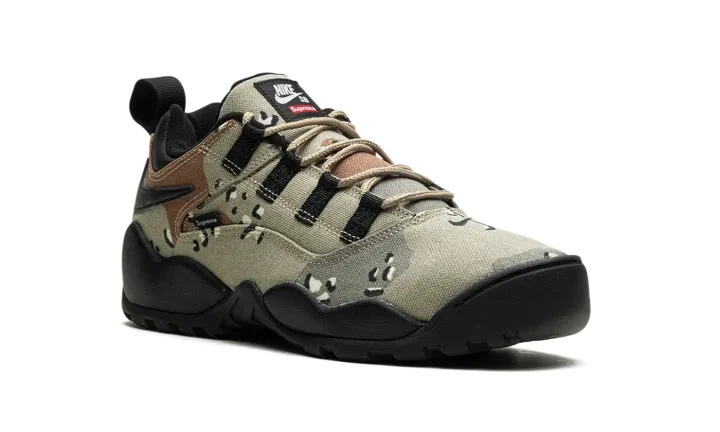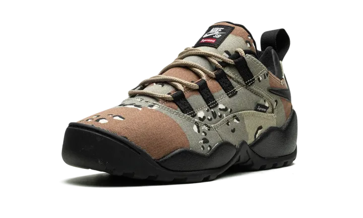The Supreme x Nike SB Darwin Low "Camo" is a collaboration by the New York based streetwear brand on a bold colorway of the retro sneaker. The Nike Darwin was designed by legendary Nike footwear designer Tinker Hatfield and worn by Dennis Rodman in the NBA. Supreme and Nike SB team up to bring back the classic 1990s-era shoe with skate-friendly updates. The "Camo" colorway features a desert camo pattern across the canvas upper in a tan, brown, green, and black color scheme. A small black Swoosh appears on the toe and a "Supreme" branded tag is seen on the lateral side of the shoe. Dual "Supreme" and "Nike SB" detailing appears on the tongue tag.