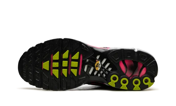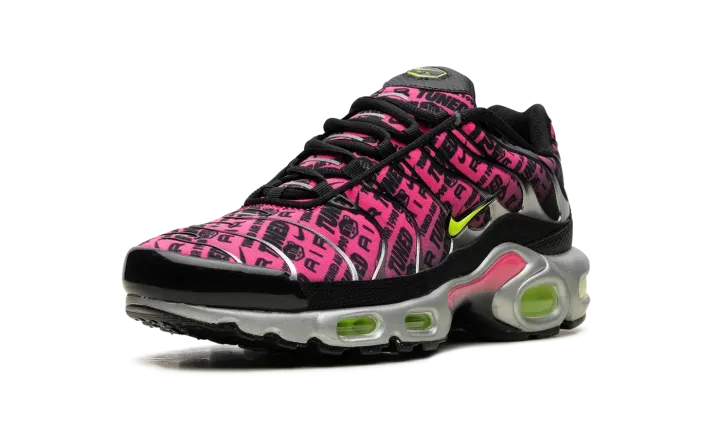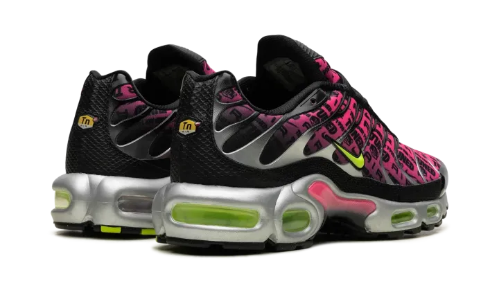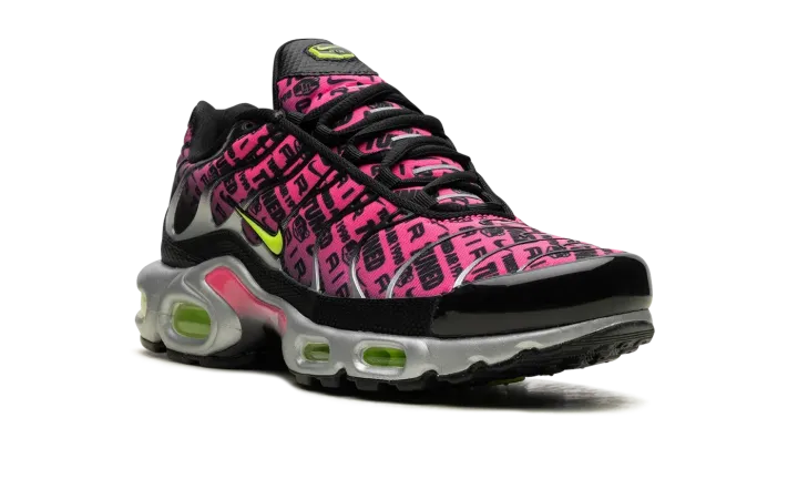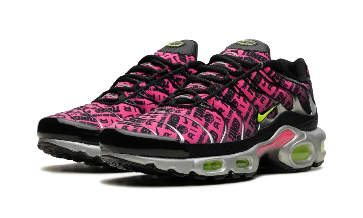 The Nike Air Max Plus "Hyper Pink/Volt" is a head-turning colorway of the retro performance running and lifestyle sneaker. Also known as the Nike Air Max Plus Mercurial XXV "Hyper Pink/Volt," this colorway features a bold look with its "Tuned Air" print in an all-over style on its design. Specifically, the shoe has a Hyper Pink textile base, a black TPU "cage," and a Volt Jeweled Swoosh on the lateral side, and a Hyper Pink outlined Swoosh on the medial side. The Air units in the forefoot and heel of the Metallic Silver painted midsole are Volt-tinted.