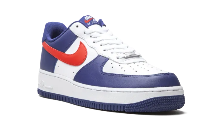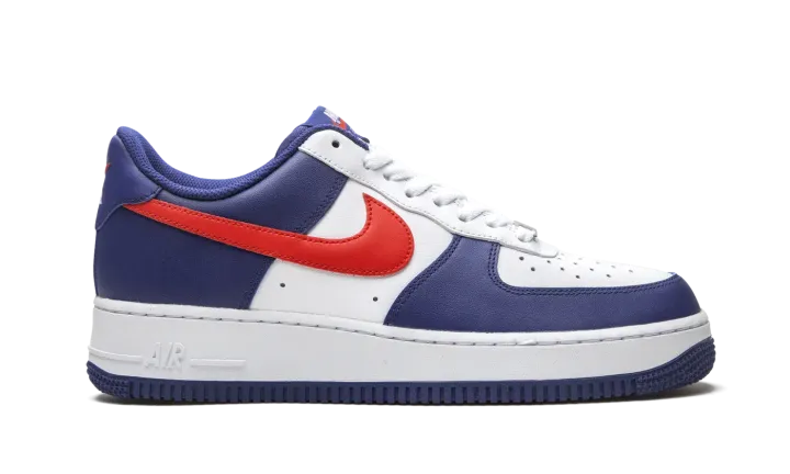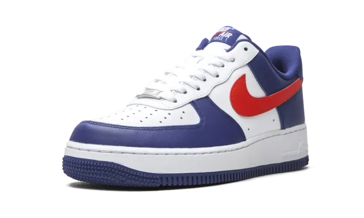 The Nike Air Force 1 Low "Independence Day" is a patriotic colorway of the retro basketball sneaker. Designed with a red, white, and blue color scheme, the "Independence Day" Air Force 1 Low features a white leather base with Sport Royal leather overlay panels and a Sport Red leather Swoosh on the side. Classic "Nike Air" branding is embroidered on the heel and printed on the tongue tag. The shoe's white rubber midsole and royal blue rubber outsole complete the look.
