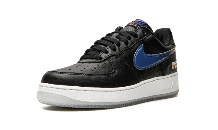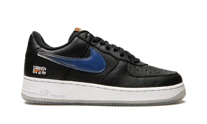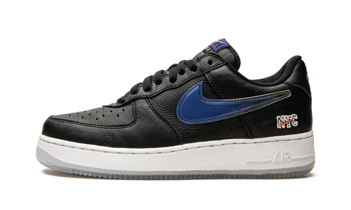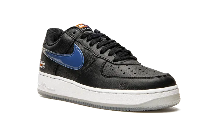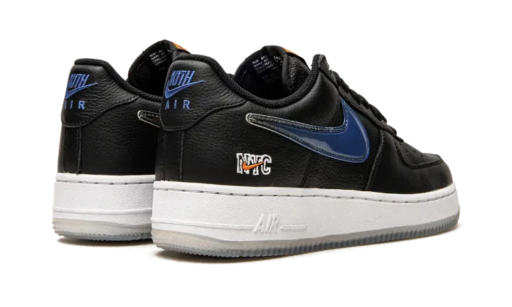 The Kith x Nike Air Force 1 Low "NYC Away" is a collaboration between Ronnie Fieg's sneaker boutique and Nike on the vintage basketball shoe in the basketball-inspired "Home" and "Away" collection. The black based "Away" version of Kith's Air Force 1 Low looks to the boutique's home, New York City, and more specifically, the New York Knicks, for design inspiration, as the shoe features the team's uniform colors on its design. The black tumbled leather upper is contrasted by a blue jeweled Swoosh on either side and old school "NYC" with an orange Swoosh branding hit on the lateral side of the heel. A "Kith Air" logo with a Swoosh is embroidered on the heel. The detailing is a play on the Air Force 1's original "Nike Air" branding. A gradient orange-to-blue "Kith Air Force 1" insignia appears on the tongue tag. Release date: December 25, 2021