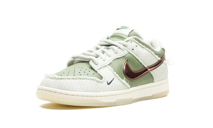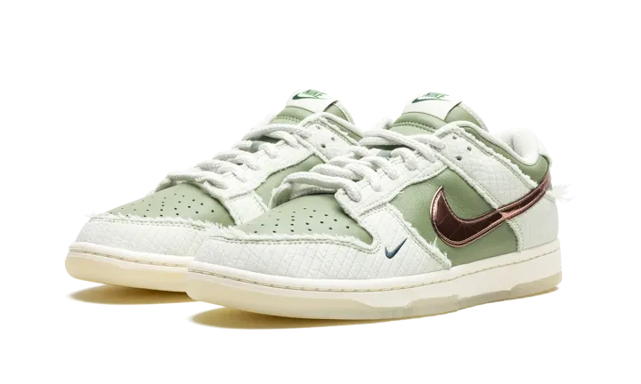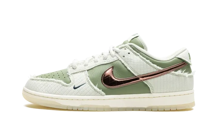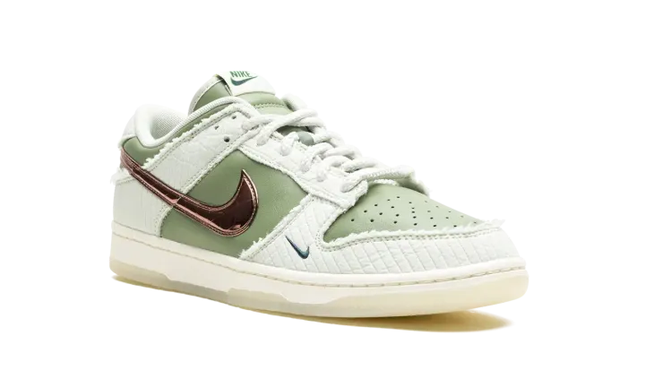 The Kyler Murray x Nike Dunk Low "Be 1 of One" is a colorway of the retro basketball shoe co-designed by the talented football player. Inspired by positivity and inclusivity, the "Be 1 of One" Dunk Low demonstrates Nike's commitment to promote a healthy community around its sneakers—and beyond. The collaboration with the star NFL quarterback features an olive leather base with quilted light olive-colored overlays with frayed edges. Metallic rose gold Swoosh branding is seen on both sides of the sneaker. Classic "Nike" branding is seen on the heel and tongue tag. "Be 1 of One" detailing is found on the underside of the tongue while thick rope laces appear on top of the tongue. Underfoot, a cream midsole and translucent rubber outsole complete the look. Release date: November 10, 2023