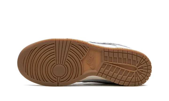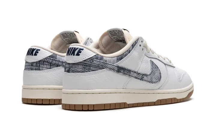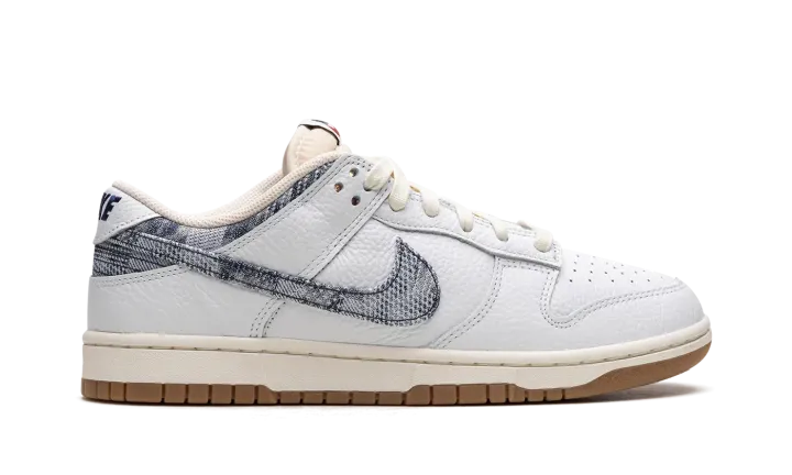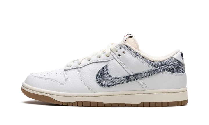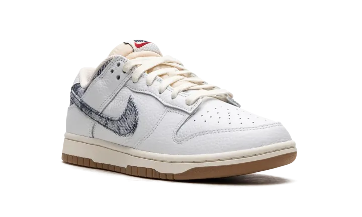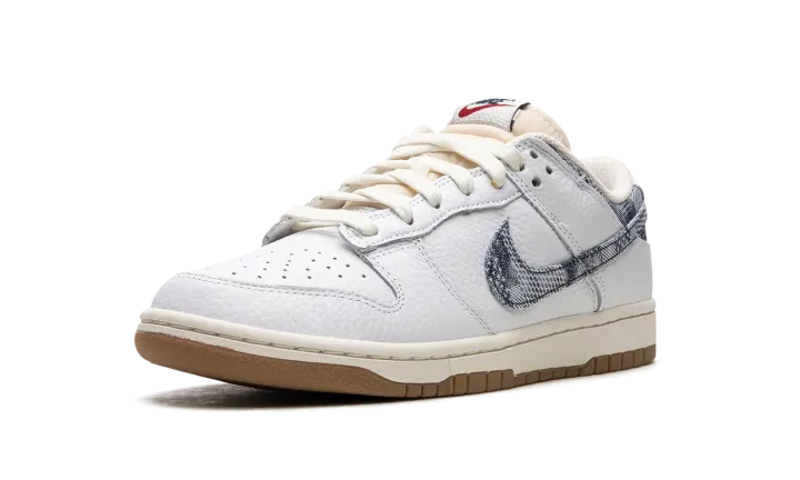 The Nike Dunk Low "Washed Denim" is a colorway of the retro basketball shoe with unique vintage-inspired details. The "Washed Denim" Dunk Low features a white leather upper with Washed Denim detailing on the Swoosh and heel tab. The cream tongue evokes a vintage, aged look, as do the laces and the cream rubber midsole. Classic "Nike" branding is embroidered on the heel and printed on the tongue above a Swoosh. A gum rubber outsole completes this unique Dunk. Release date: June 3, 2023