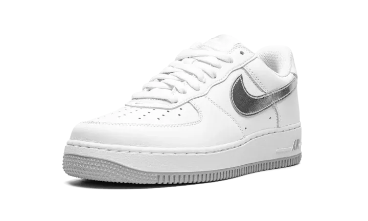 The Nike Air Force 1 Low "Silver Swoosh" is a versatile colorway of the vintage basketball sneaker based on its "White on White" design, but with a twist. Just like the Air Force 1's "White on White" colorway, the "Silver Swoosh" has an all-white leather upper, but trades the former's white leather Swoosh for a Metallic Silver leather Swoosh. As for the rest of the shoe, silver, old school-inspired "Nike Air" branding is embroidered on the heel. Silver "Air Force 1" branding is printed on the tongue tag. A grey "Air" logo is found on the lateral side of the white rubber midsole. Release date: December 7, 2022