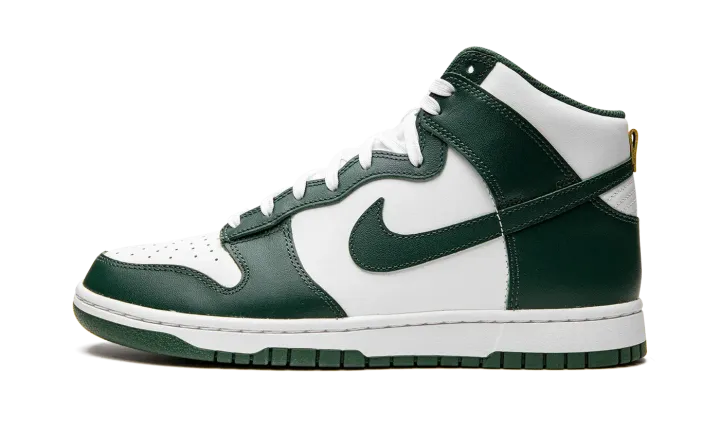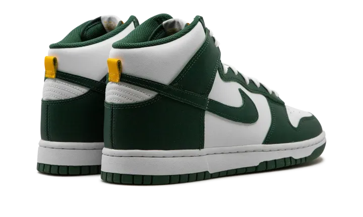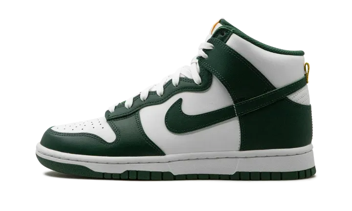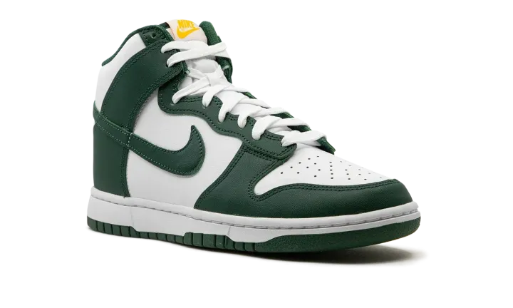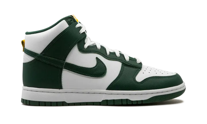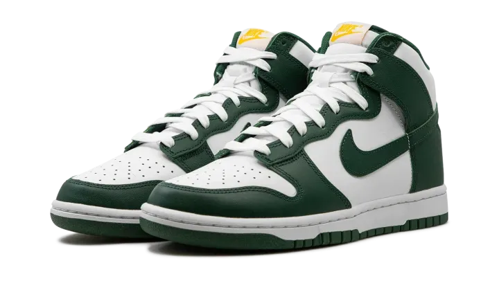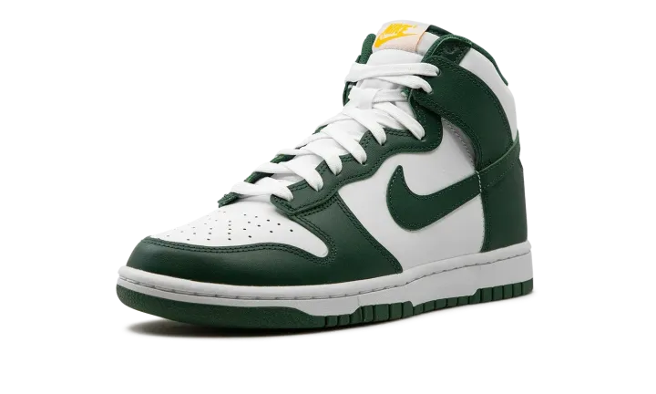 The Nike Dunk High "Noble Green" is a two-tone, white and green colorway of the popular retro basketball shoe. Also known as the "Australia" due to it being reminiscent of the colors found on many of the country's national sports teams, the "Noble Green" features a white leather base with contrasting Noble Green-colored overlays and Swoosh branding. Both the "Nike" and Swoosh logos found on the tongue tag appear in University Gold. White laces on the white tongue help add another layer of contrast to the shoe's green accenting. Underfoot, a white midsole and Noble Green rubber outsole complete the look. Release date: July 19, 2022