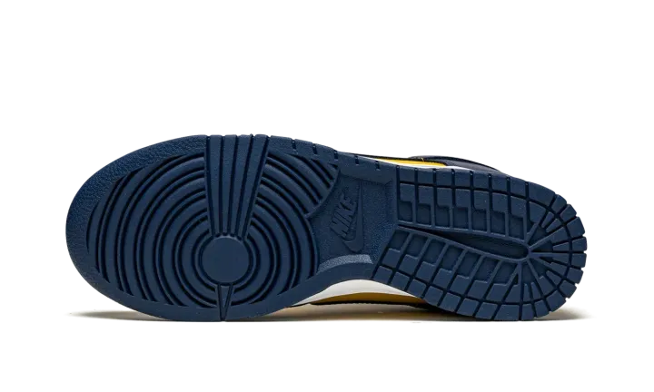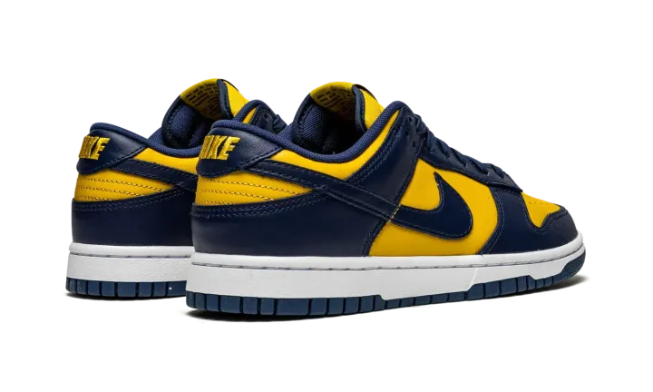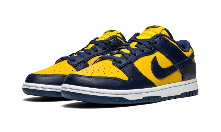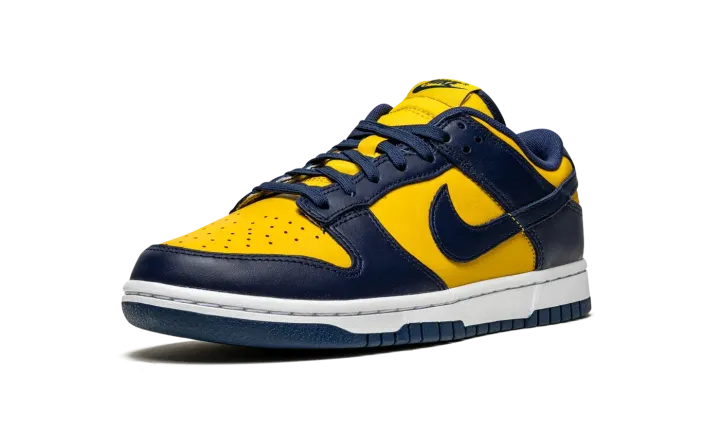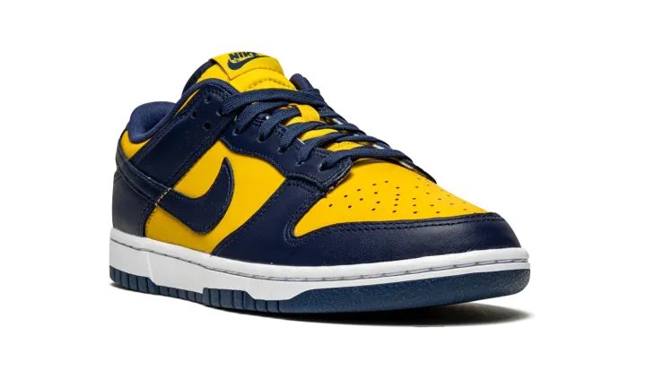 The Nike Dunk Low "Michigan" is the low-top version of an original Dunk colorway worn by the Michigan Wolverines basketball team in 1985. The "Michigan" first appeared in 1985's "Be True to Your School" collection of college basketball inspired Dunks. The Varsity Maize and Midnight Navy design was brought back in September 2020 on the Dunk High. This low-top silhouette of the retro basketball model follows the same style cadence as the original and high-top edition. Varsity Maize leather appears on the perforated toe and on the mid-panel, collar, and heel. Contrasting Midnight Navy leather panels on the upper break up the look. A navy blue Swoosh graces either side of the shoe and yellow "Nike" embroidery is stitched onto the heel. Blue shoe laces are layered over the Varsity Maize nylon tongue. The Nike Dunk Low "Michigan" is an iconic colorway of the retro basketball, skateboarding, and lifestyle shoe. Release date: April 16, 2021.