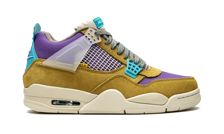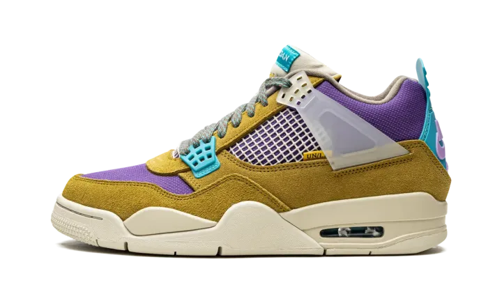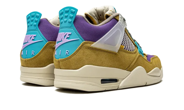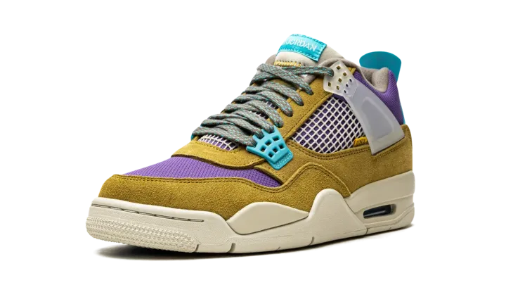 Desert moss/turquiose/blue suede x Union Air Jordan 4 Retro SP sneakers "30th Anniversary - Desert Moss" from JORDAN featuring panelled design, mesh detailing, logo patch at the tongue, raised logo detail, round toe, front lace-up fastening, signature Air cushioning, rubber sole, transluscent wings, stitched-down tongue and Release date: June 20, 2021. These styles are supplied by a premium sneaker marketplace. Stocking only the most sought-after footwear, they source and curate some of the most hard to find sneakers from around the world..