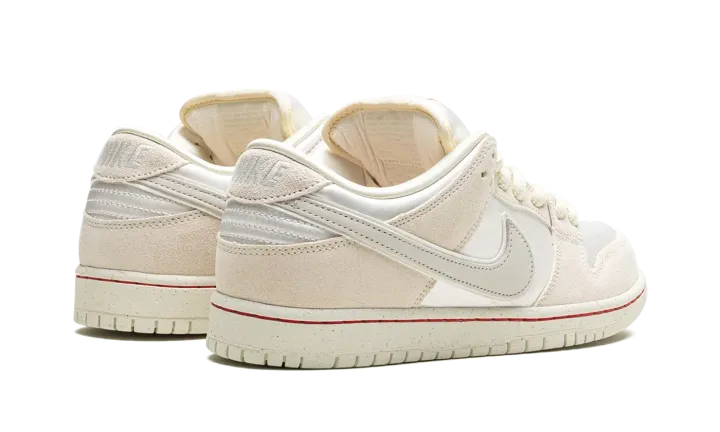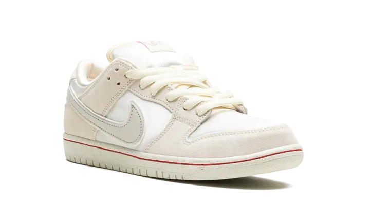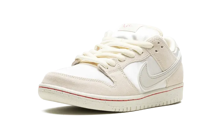 The Nike SB Dunk Low "Valentine's Day - Low Love Found" is a colorway of the retro skateboarding shoe from the collection that draws inspiration from the "Red Thread of Fate" mythology. The shoe has a minimalist design with a combination of Coconut Milk leather and Light Bone suede panels, respectively. A Light Bone leather Swoosh appears on either side of the shoe. Classic "Nike" branding is embroidered on the heel. A red string is woven into the design of the "Nike SB" detailing found on the tongue tag, a nod to the symbol of enduring connection represented by the red thread of fate. Release date: February 14, 2024