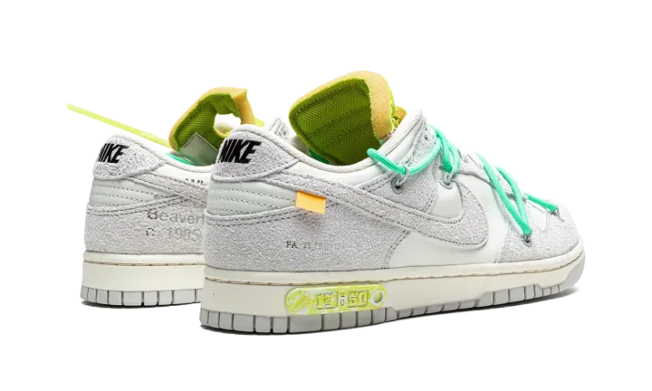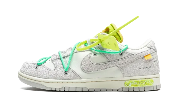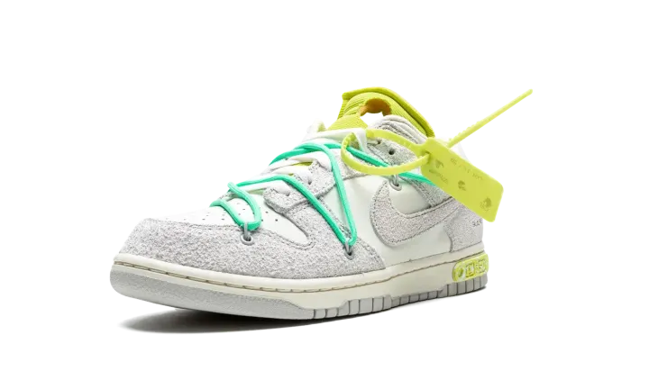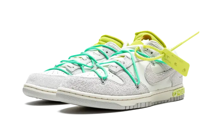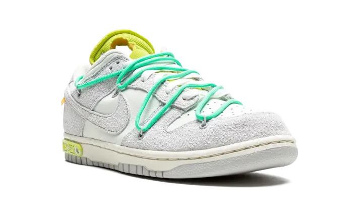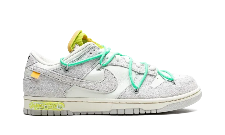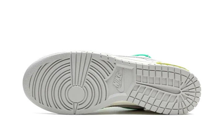 White/grey/yellow/green leather x Off-White Dunk Low "14/50" sneakers from NIKE featuring signature Swoosh logo detail, embroidered logo to the rear, slogan print, contrasting panel detail, round toe, rope detailing, branded insole and rubber sole. These styles are supplied by a premium sneaker marketplace. Stocking only the most sought-after footwear, they source and curate some of the most hard to find sneakers from around the world..