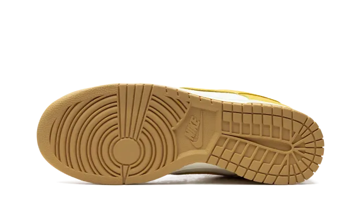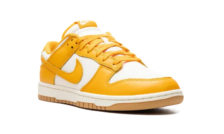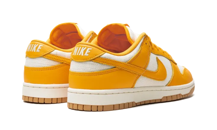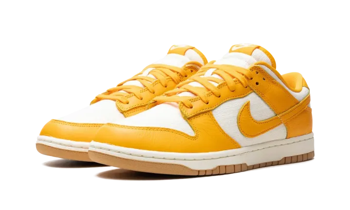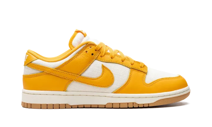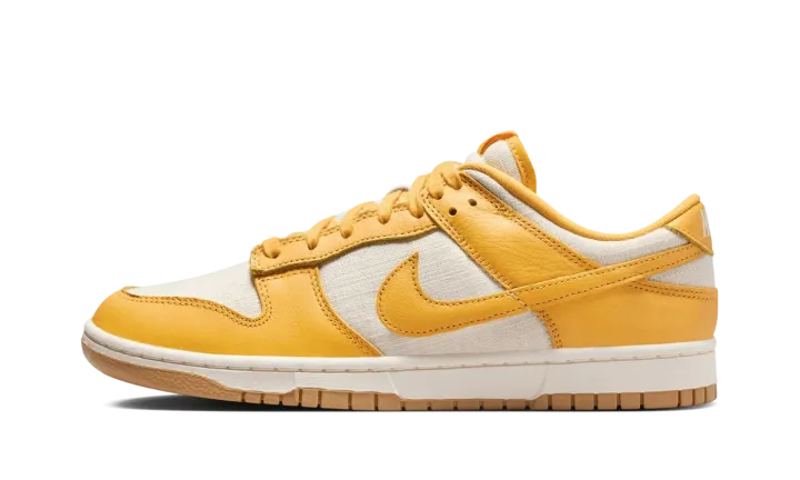 The Nike Dunk Low "University Gold" is a head-turning colorway of the always-popular retro basketball shoe. The upper is complete with a Coconut Milk-colored hemp woven base with University Gold leather overlays and Swoosh branding. A "Nike" logo is embroidered on the heel, and "Nike" and Swoosh logos appear on the University Gold nylon tongue tag. University Gold laces, a Coconut Milk rubber midsole, and a Gum rubber outsole complete the look. Release date: May 22, 2024