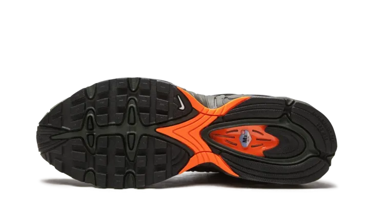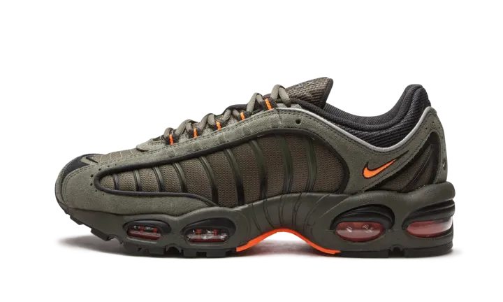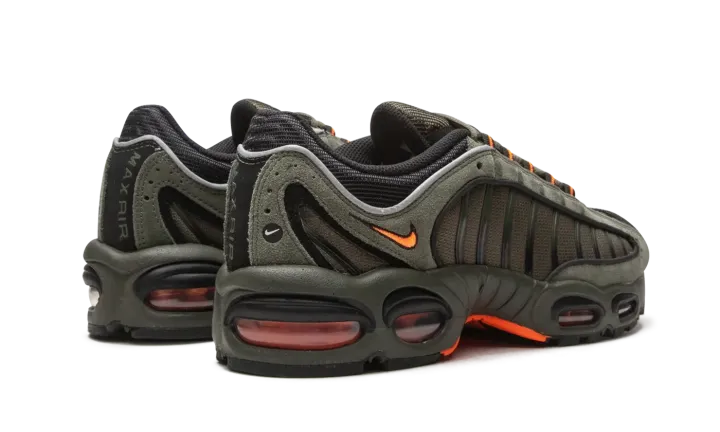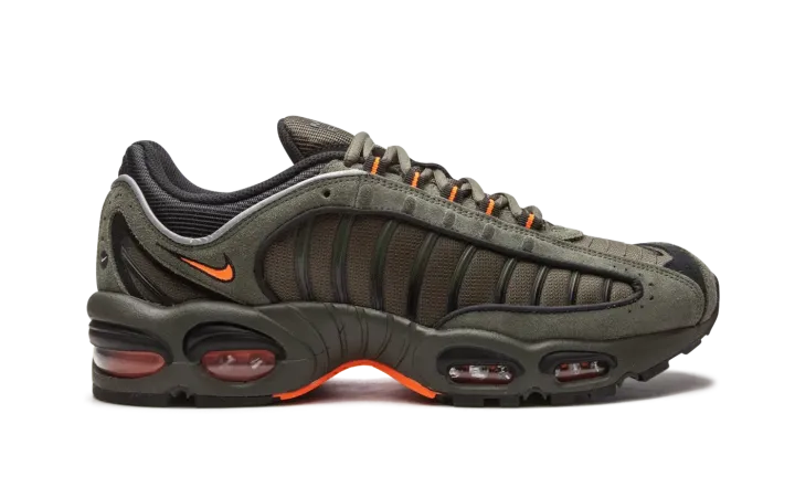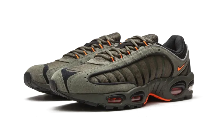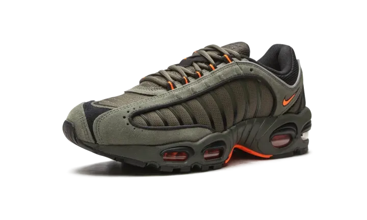 The Nike Air Max Tailwind 4 "Flight Jacket" is a military-inspired colorway of the retro running shoe that was released in Summer 2019 by Nike. Reminding many of Undefeated's incredibly rare Air Jordan 4 collaboration from 2005, this "Flight Jacket" edition of the Air Max Tailwind 4 also borrows graciously from rugged military aesthetics, and the results are clearly favorable. Both the model's mesh base and suede overlays are dressed in a dark olive green hue commonly associated with military gear. An orange embroidered Swoosh appears on the lateral side and olive "Max Air" detailing on the black synthetic heel overlay. Black mesh can be found on the collar and olive green mesh appears on the tongue. The black nylon eyestays feature orange accenting for a subtle pop of color. Underneath, orange-tinted visible Air bubbles in both the forefoot and the heel finish off the look.