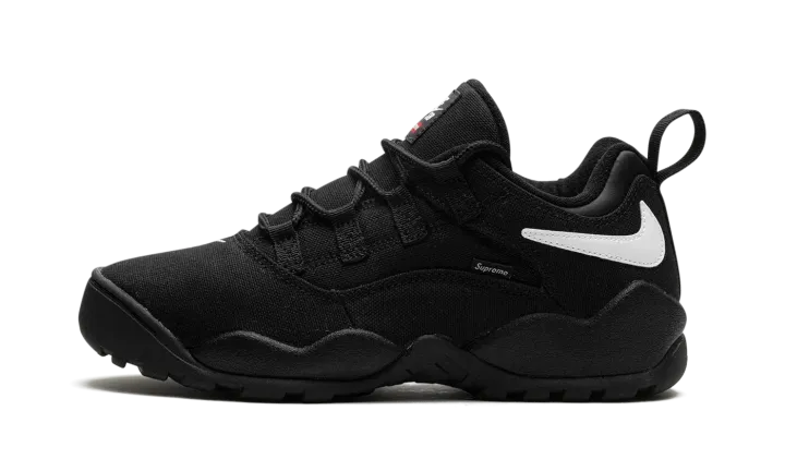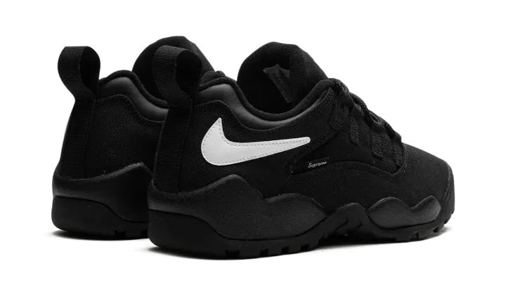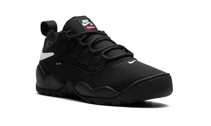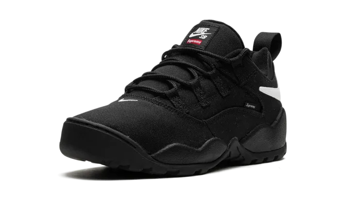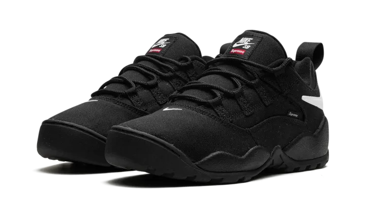 The Supreme x Nike SB Darwin Low "Black" is a collaboration by the "World Famous" streetwear brand on a versatile colorway of the retro skate and basketball shoe. The Nike Darwin was designed by legendary Nike footwear designer Tinker Hatfield and worn by Dennis Rodman in the NBA before it became indoctrinated into the skateboarding world thereafter. Supreme and Nike SB team up to bring back the classic 1990s-era shoe with skate-friendly updates. The "Black" colorway features a black canvas construction with a white reversed Swoosh on the collar. A "Supreme" branded tag is seen on the lateral side of the shoe. Co-branding appears on the tongue.
