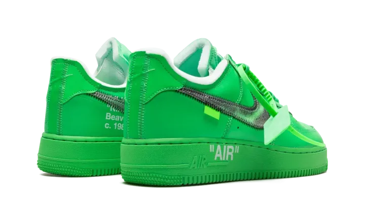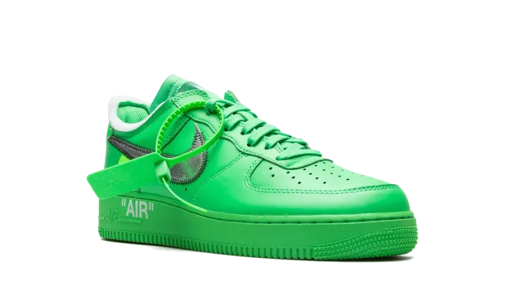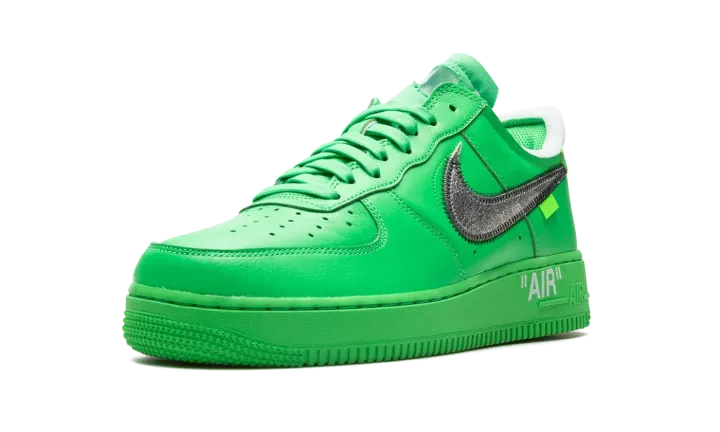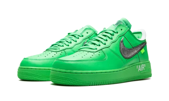 The Off-White x Nike Air Force 1 Low "Brooklyn" in green is a collaboration between the late Virgil Abloh, his high fashion and streetwear brand, and Nike on the retro basketball shoe. The "Brooklyn" colorway was teased by Tremaine Emory, Abloh's friend, and Creative Director of Supreme, in spring 2022. The shoe features a monochromatic green appearance with a contrasting Metallic Silver leather Swoosh on the sides. A green plastic zip tie is a signature Off-White design element. Industrial-style "Off-White" detailing is printed on the medial side of the shoe. "AIR" branding is printed near the original "Air" insignia on the lateral side of the midsole. Release date: September 13, 2022