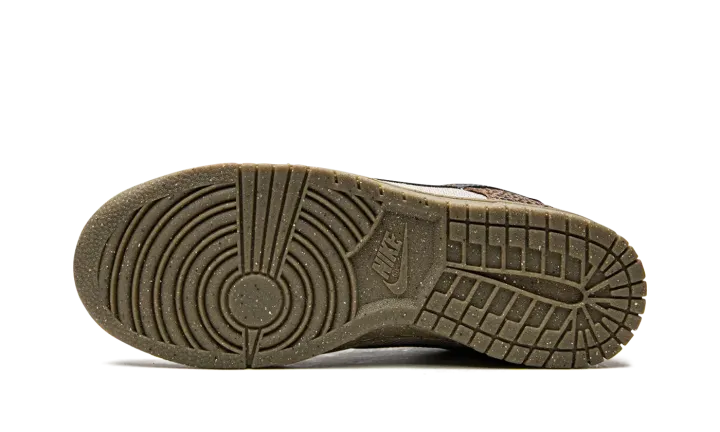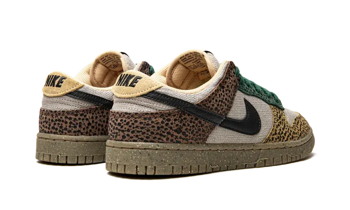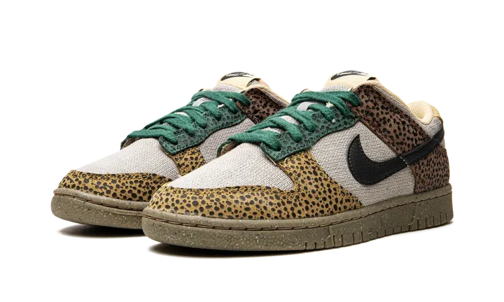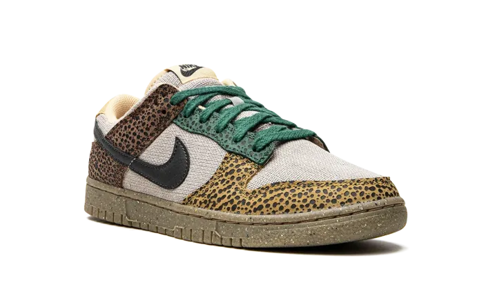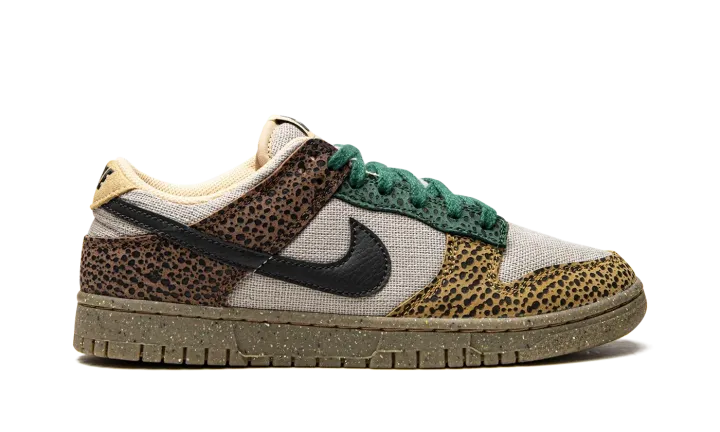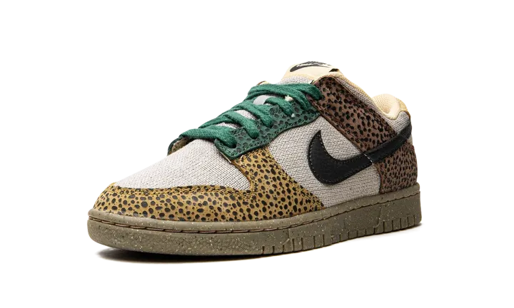 The Nike Dunk Low "Safari Golden Moss" is a bold colorway with head-turning, outdoors-inspired patterning on its design. The "Safari Golden Moss" is equipped with mismatched, earth tone safari print overlays. The tan-colored hemp base allows the aforementioned patterns to garner attention. A black leather Swoosh logo can be found on both sides of the shoe and a black "Nike" logo appears on the tan heel overlay. Black "Nike" and Swoosh branding is located on the tongue. Additional details include green and black laces and a gum rubber sole with speckling that subtly nods to the Nike ACG footwear line. Release date: August 2, 2022
