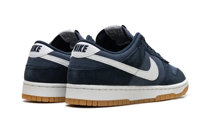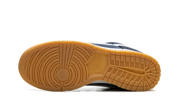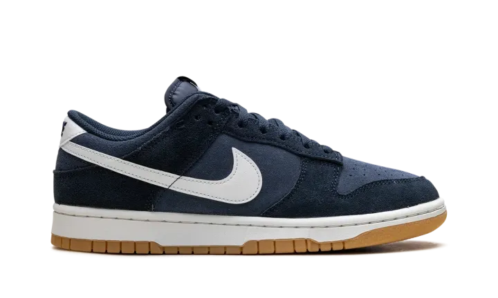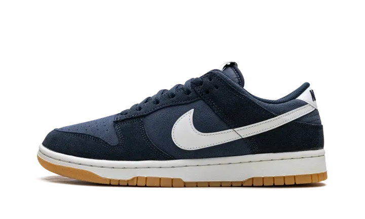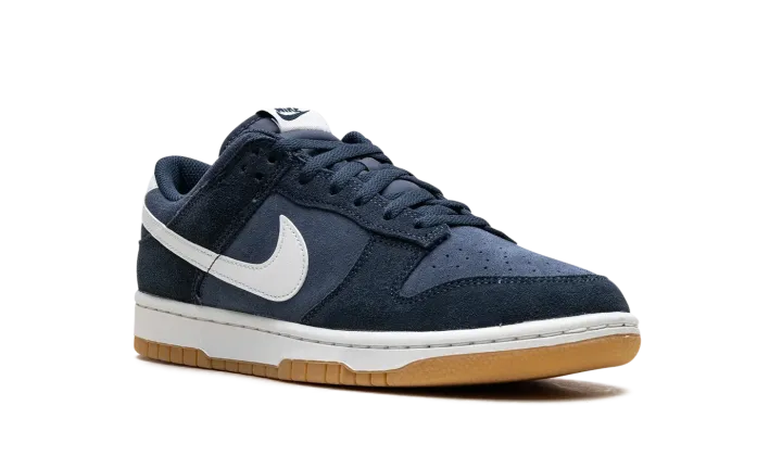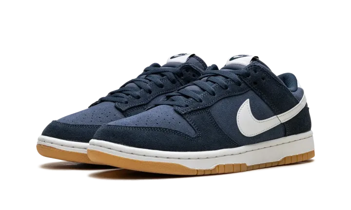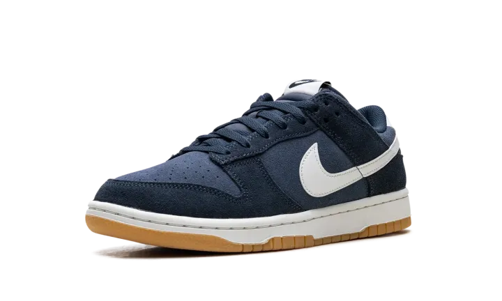 The Nike Dunk Low SE Monsoon Blue is a suede upper low top leather athletic shoe with Armory Navy and Monsoon Blue overlays and underlays. The Nike Swoosh and branded heel tab in white leather pop against the muted two-tone Blue suede, while coordinating with the white midsole and Gum Yellow outsole. Nike branding on the tongue completes the aesthetic.