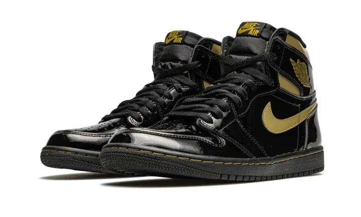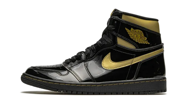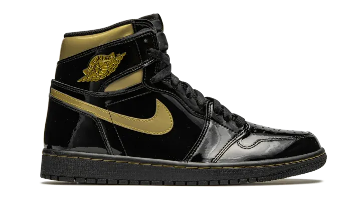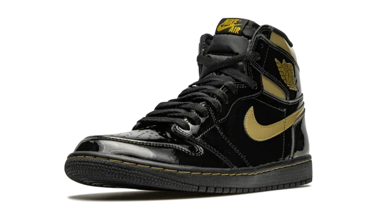 The Air Jordan 1 High OG "Black/Metallic Gold" is one of several exciting colorways from Jordan Brand's Holiday 2020 collection. A luxurious take on Michael Jordan's first signature shoe in the coveted high-top silhouette, the "Black/Metallic Gold" employs premium black patent leather on the entire upper, including the perforated toe, mid-panel, and heel. The look is reminiscent of the Jordan 1 Mid from 2003 that featured the same black leather upper with Metallic Gold accenting. Like that release, the modern look displays a gold leather Swoosh on either side and a gold "Wings" emblem on the collar. Additional Metallic Gold detailing appears beneath the collar overlay and on the "Nike Air" insignia on the black nylon tongue tag. A black rubber sole puts the finishing touches on the glossy Jordan 1 High "Black/Metallic Gold." Release date: November 30, 2020.