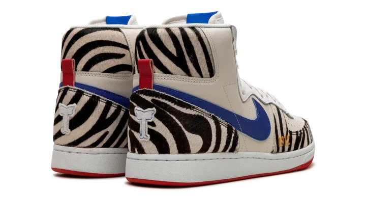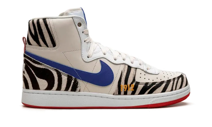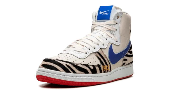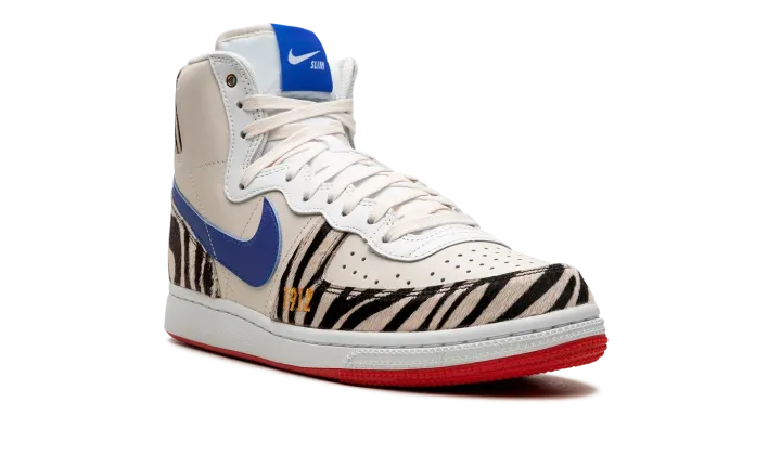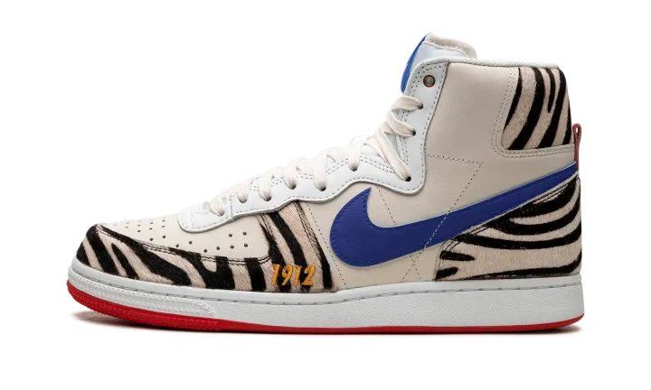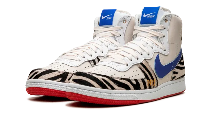 The Nike Terminator High "Slim & Husky's Pizza" is a colorway of the retro sneaker inspired by the Nashville, Tennessee based pizza chain founded by Tennessee State University graduates. From a collection of HBCU-theme sneakers by Nike, the Terminator High "Slim & Husky's Pizza" has an undeniably unique look. The upper features a Phantom-colored leather base with eye-catching zebra print on the faux-pony hair overlays. Racer Blue leather Swoosh branding can be found on both sides of the shoe. A "1912" embroidered logo on the forefoot salutes TSU's founding year while "Slim" and "Husky's" detailing appear separately on the left and right tongue, respectively. Release date: November 4, 2023