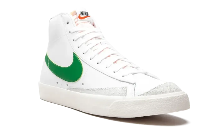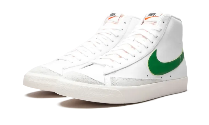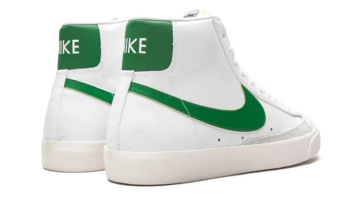 The Nike Blazer Mid '77 VNTG "White/Pine Green" is a timeless look for the retro basketball and lifestyle shoe. Unofficially inspired by the team uniform colors of the Boston Celtics, the "White/Pine Green" features a white leather construction with vintage-looking suede panels on the side and the toe box. A green leather Swoosh appears on either side of the shoe and throwback "Nike" detailing dots the heel. Exposed foam on the side of the white nylon tongue references the style of the 1970's-era Nike Blazer. The midsole has a yellowed appearance that makes the shoe look slightly aged for a vintage aesthetic.