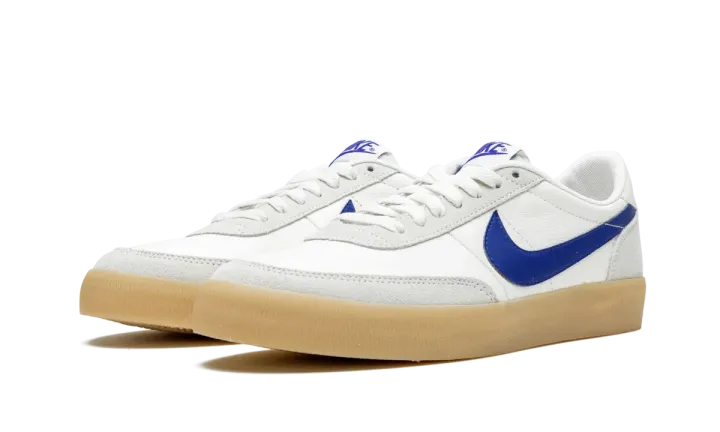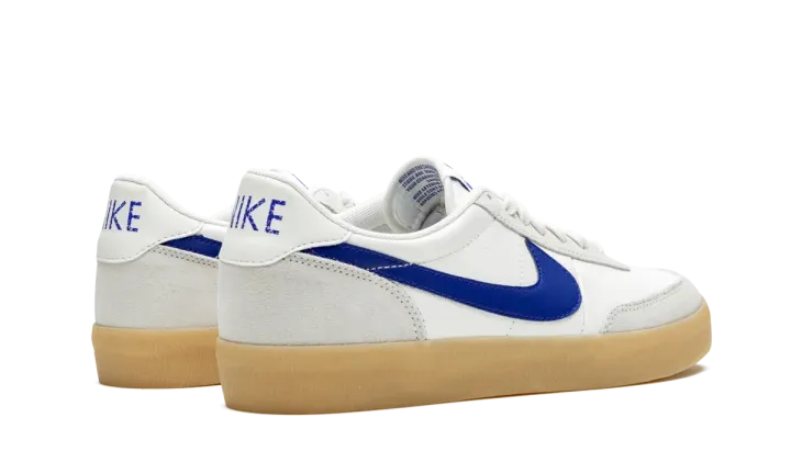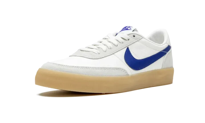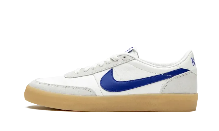 The Nike Killshot 2 Leather is a modern version of an OG low-profile tennis shoe that made its way back onto shelves in 2012 as a J. Crew exclusive. This lifestyle sneaker is designed with a smooth white leather upper and grey suede paneling by the toe, lace guards, and heel. A bold Swoosh and Nike heritage logos on the tongue and heel contrast the neutral color base in royal blue. The rubber gum sole adds a retro look and durable traction.
