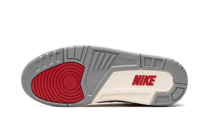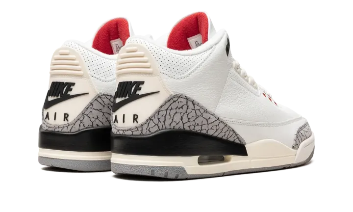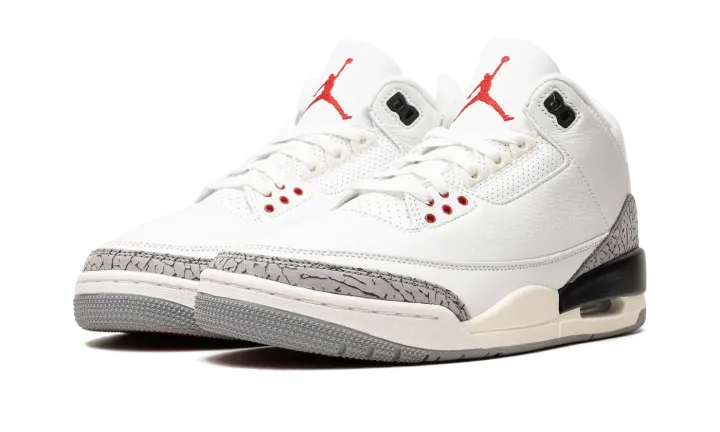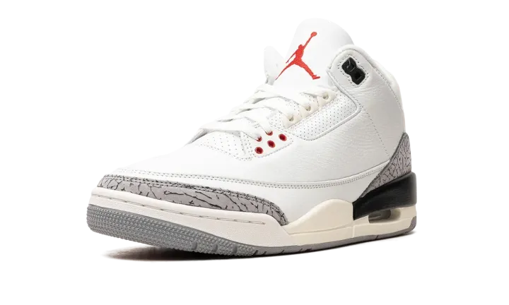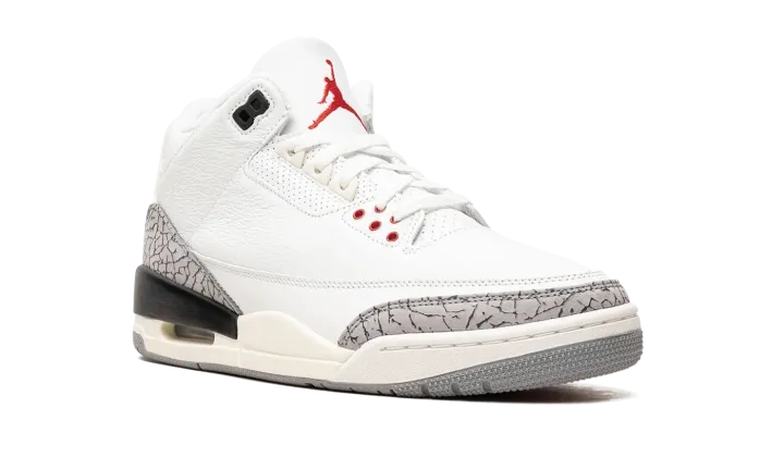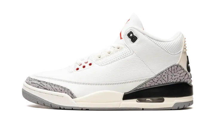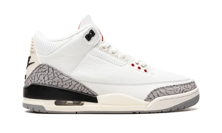 The Air Jordan 3 "White Cement Reimagined" is a special version of the classic basketball sneaker that replicates the model's original design. Released by Jordan Brand in 2023 to celebrate the iconic Jordan 3's 35th anniversary, the "White Cement Reimagined" retains the look of the model's "White Cement" colorway with accurate-to-original panels, colors, and overall shape. Faithful to the 1988 version of the Jordan 3 "White Cement," the "Reimagined" features a higher-cut ankle collar inspired by the OG Jordan 3's design. It also is equipped with a white leather upper with contrasting grey elephant print on the toe and heel, which has also been modified to look like the detailing on the original Jordan 3. The "Nike Air" branded heel counter has an aged, vintage look, as does the midsole. A red Jumpman logo is embroidered on the tongue. Release date: March 11, 2023
