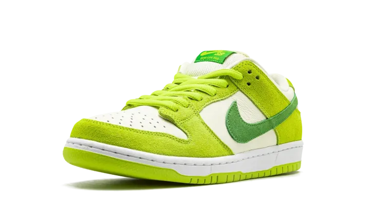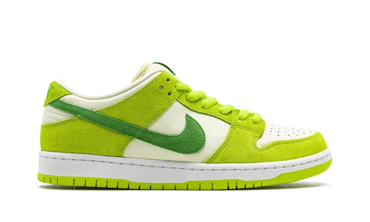 The Nike SB Dunk Low "Green Apple" is a fun colorway from the "Fruit Pack" released by the skate brand in June 2022. The summer-inspired design features cream-colored leather on the perforated toe, mid-panel, collar, and heel. Contrasting Green Apple suede overlays and Swoosh branding attract attention. Classic "Nike" branding is embroidered on the heel and "Nike SB Dunk" insignia is found on the green nylon tongue tag on the puffy cream mesh tongue. A drop-in Zoom Air unit in the heel of the midsole provides a comfortable ride and impact absorption while skating.