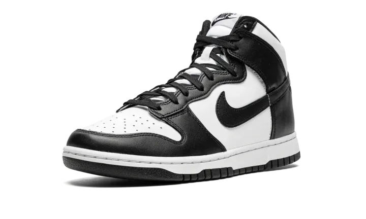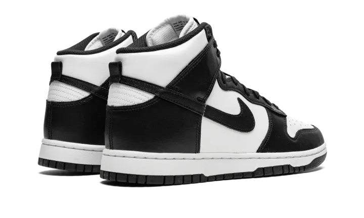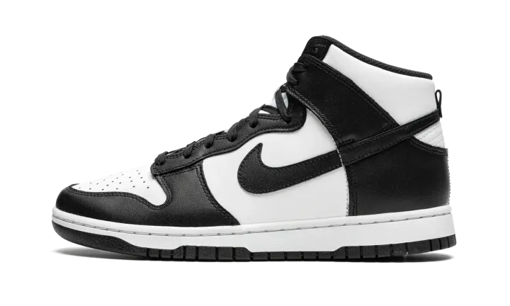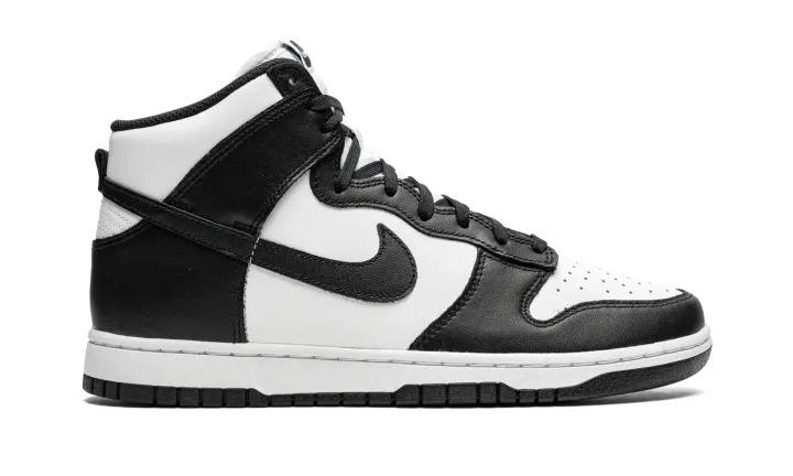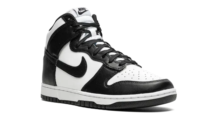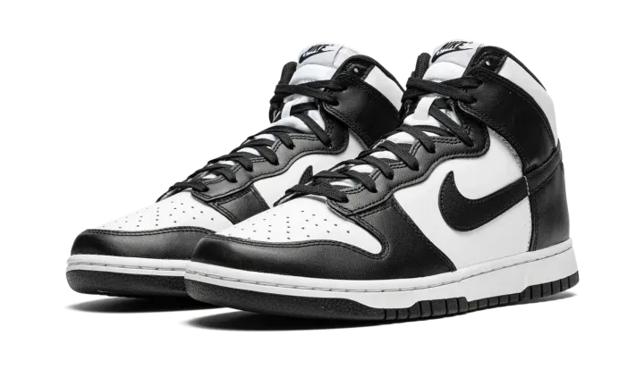 The Nike Dunk High "Black/White" or "Panda" is a two-tone, white-and-black colorway of the vintage basketball shoe that was released in January 2022. An all-time classic style, the black-and-white Dunk features white leather on the perforated toe, mid-panel, collar, and heel. The neutral-colored base is contrasted with black leather overlays and Swoosh branding. The shoe's two-tone, appearance continues with a black interior lining, a white nylon tongue, and white nylon tongue tag with black "Nike" and Swoosh branding. Black laces, and a white midsole and black outsole finish off the look. Release date: January 27, 2022