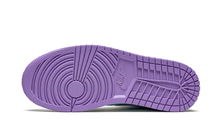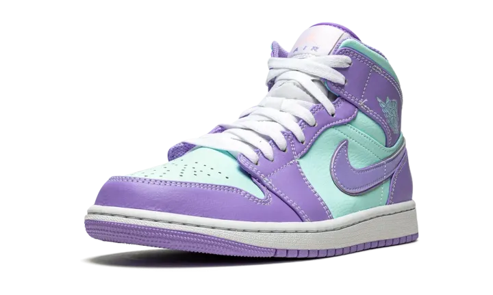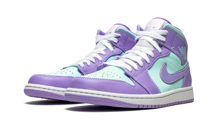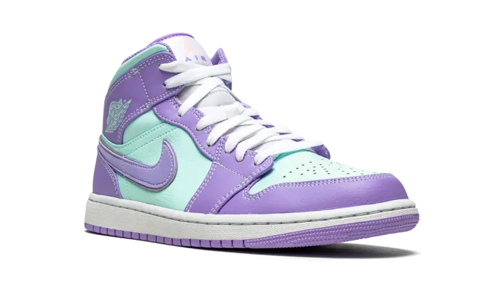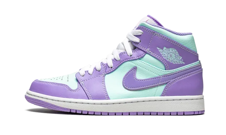 The Air Jordan 1 Mid "Purple Pulse/Glacier Blue" is a bold colorway of Michael Jordan's first signature shoe that stands out from the crowd. Cutting an Easter-ready look, the "Purple Pulse/Glacier Blue" is dressed in a two-tone color block of pastel purple and mint green. The forefoot, eyelets, collar, heel, and Swoosh are displayed in Purple Pulse tumbled leather. Jordan Brand contrasts the look with Glacier Blue leather on the perforated toe, mid-panel, collar, and "Wings" detailing. A pink Jumpman above purple "Air" branding highlights the look of the white nylon tongue tag. White shoelaces are layered over the white nylon tongue. Underfoot, a white midsole and Purple Pulse colored rubber outsole complete the look.