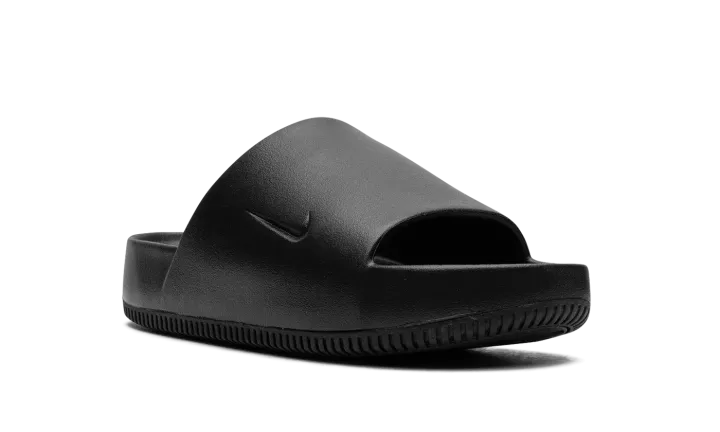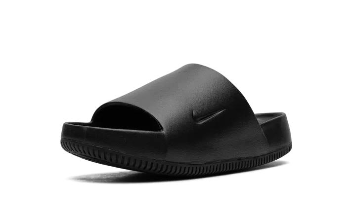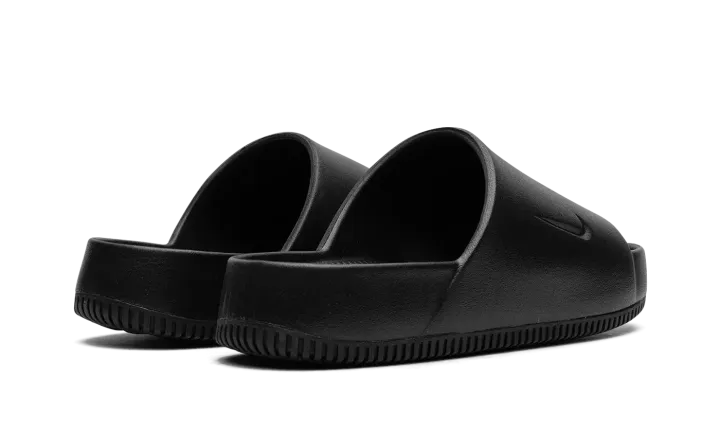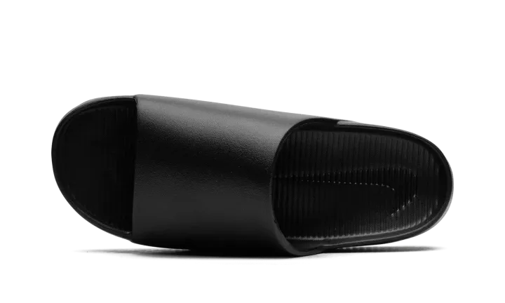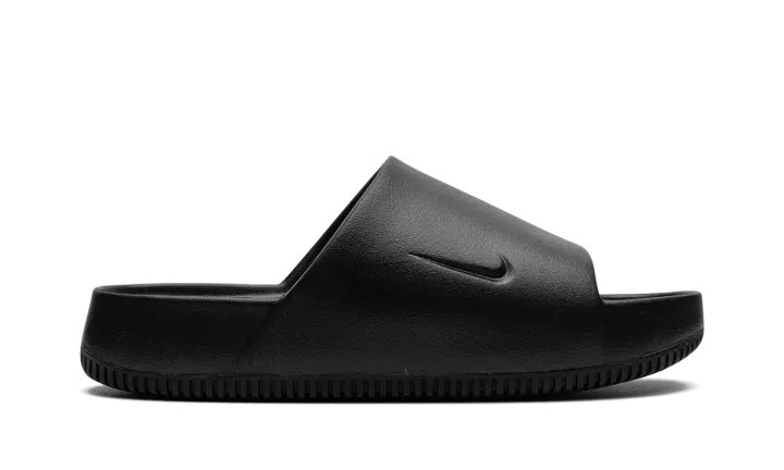The Nike Calm Slide "Black" is a versatile, monochromatic black colorway of the comfortable slip-on sandal. Designed for post activity wear, the Calm Slide debuted in 2023 in several appealing colorways, including in this easy-to-style "Black" design. The sandal is constructed from a black one-piece foam mold. The midfoot strap that supports the sandal features a debossed Swoosh on the side. Underneath, a thick foam cushioning footbed provides a comfortable ride.