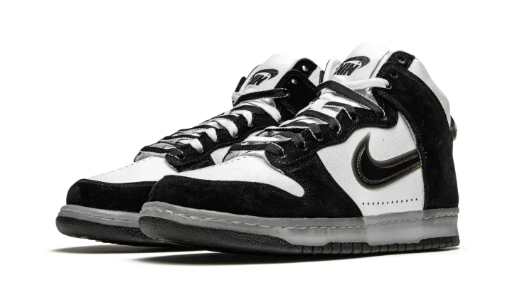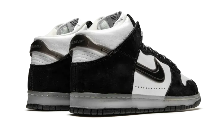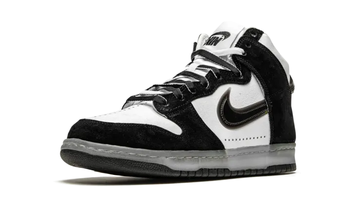 The Slam Jam x Nike Dunk High "Black/White" is an October 2020 collaboration between the Italian sneaker boutique and Nike on the all-time classic high-top shoe. Inspired by Slam Jam's rebellious attitude, the "Black/White" colorway features an upside down Nike Air logo on the tongue tag that pretty much summarizes what this simple yet nuanced look is all about. Other details include crisp white leather on the toe, mid-panel, and collar. Contrasting black synthetic nubuck overlays can be found on the forefoot, eyelets, collar, and heel. Slam Jam and Nike continue the black and white theme on the rest of the shoe, opting for black and white shoelaces on top of the white tongue. A semi-translucent gum colored Swoosh appears on either side of the shoe. Underfoot, a clear midsole and solid black outsole finishes off the look. Release date: October 30, 2020.