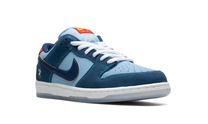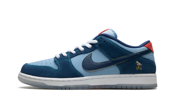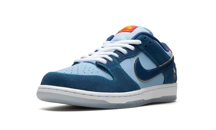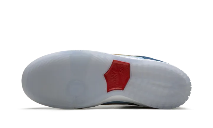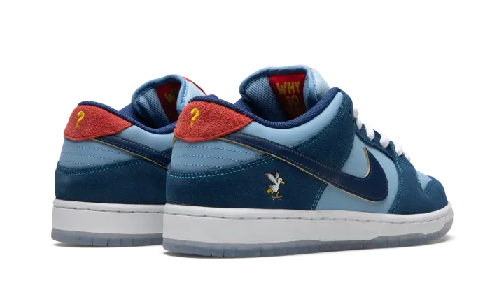 The Why So Sad? x Nike SB Dunk Low is a special collaboration between pro skater John Rattray's mental health initiative and Nike SB on the classic skate shoe. Rattray, an advocate for mental health, started his "Why So Sad?" campaign as a way to raise awareness for suicide prevention in skateboarding and beyond. His take on the SB Dunk aims to open up the conversation about the importance of mental health in skateboarding. The shoe features a Coastal Blue leather base that's contrasted with dark blue leather overlays and Swoosh branding, both of which feature a tear-away design that reveals yellow accenting after significant wear. An embroidered logo of a bird is found on the lateral side of the heel. Yellow "Nike SB Dunk Low Pro" insignia is found on the red nylon tongue tag. A yellow question mark is embroidered on the red suede heel tab. Underfoot, a white rubber midsole and icy blue translucent outsole complete the look. Release date: November 4, 2022