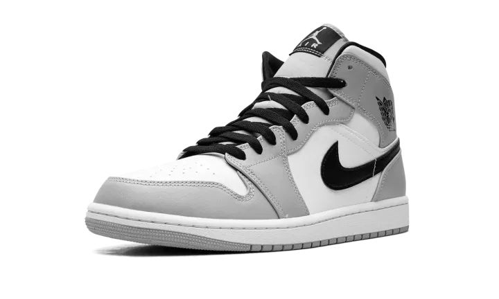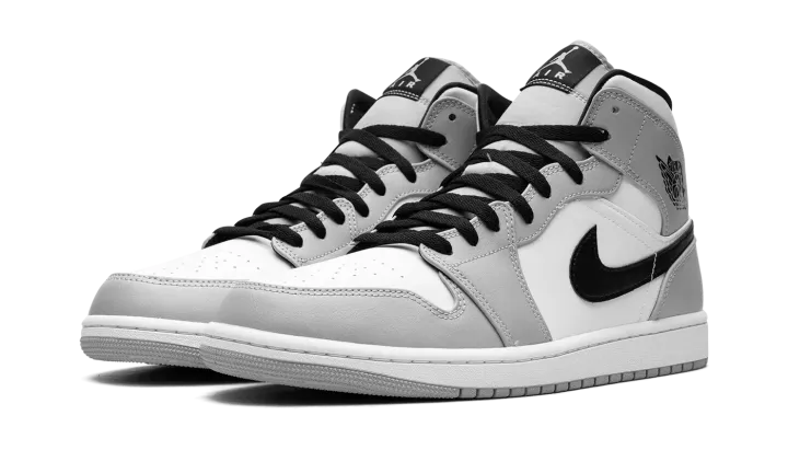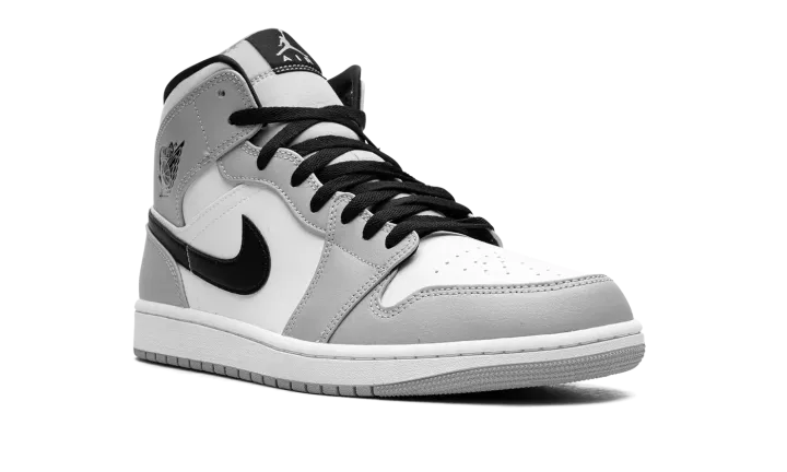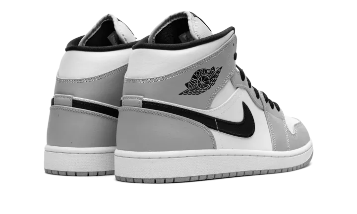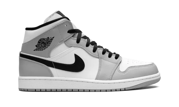 The Air Jordan 1 Mid "Light Smoke Grey" finds Michael Jordan's first signature shoe in mid-top form in a shadowy, ultra versatile color scheme. The Jordan 1 Mid has gained popularity in sneaker culture for its unique mid-top shape and range of desirable colorways. Both aspects come into play on the "Light Smoke Grey" colorway. White leather forms the base of the upper, appearing on the perforated toe, mid-panel, and collar. Light Smoke Grey leather overlays can be found on the forefoot, eyelets, collar, and heel. A black leather Swoosh is located on each side and black "Wings" branding dots the collar. Jordan Brand finishes off the look of this subdued design with a grey nylon tongue, black laces, and black nylon tongue tab with grey Jumpman detailing. The Air Jordan 1 Mid "Light Smoke Grey" was released on June 9, 2020.