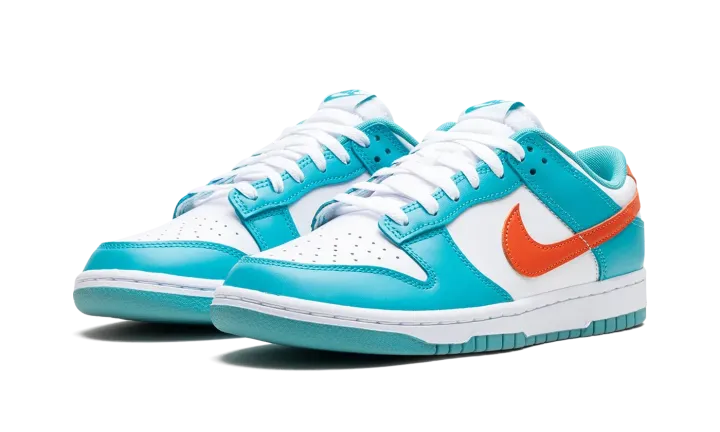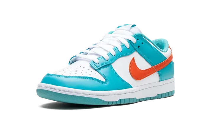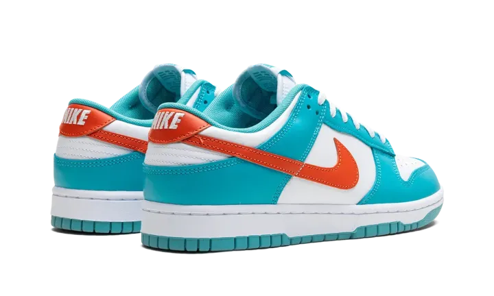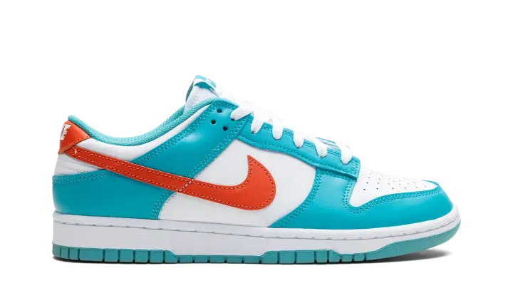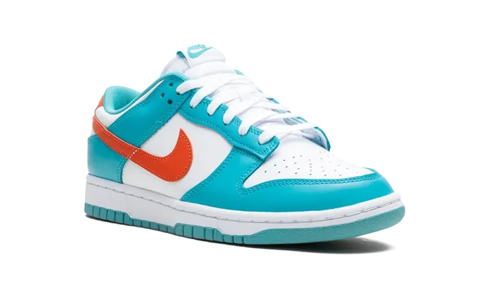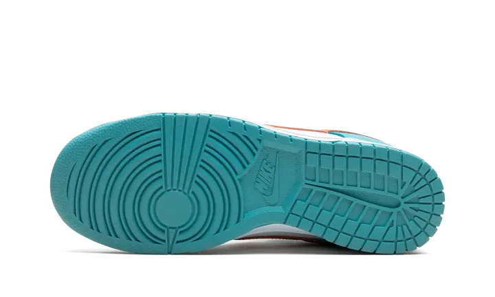 The Nike Dunk Low "Dolphins" is a colorway of the retro basketball sneaker that features the team uniform colors of the NFL's Miami Dolphins. In no way officially affiliated with the Dolphins, the colorway nicknamed after the football team nonetheless salutes the squad by featuring its uniform colors on its design. The upper has a white leather base with aqua leather overlays. An orange leather Swoosh is seen on both sides of the shoe. "Nike" branding is embroidered in white lettering on the orange leather heel tab. Aqua "Nike" and Swoosh logos are seen on the tongue tag. A white rubber midsole and aqua rubber outsole complete the look.