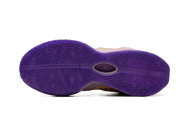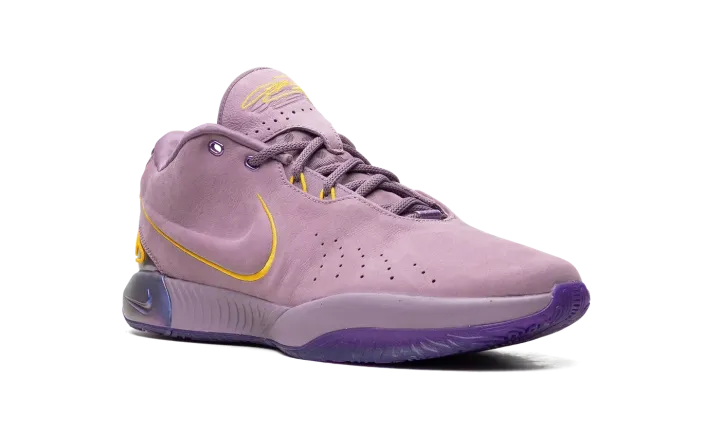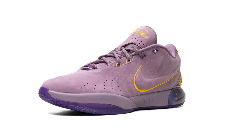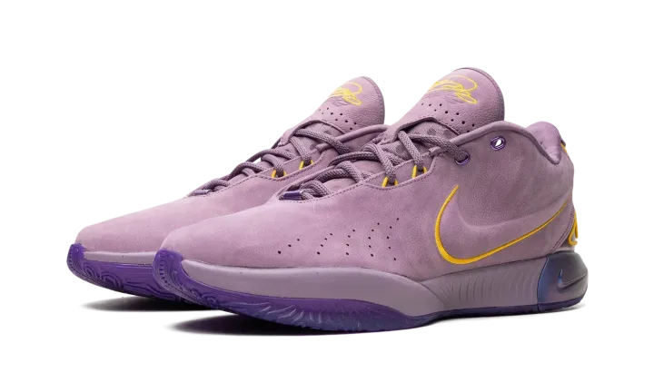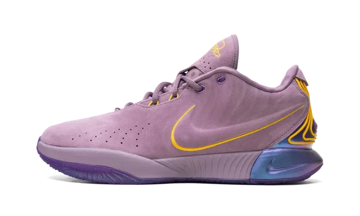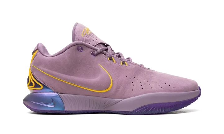 The Nike LeBron 21 "Purple Rain" is the launch colorway of LeBron James's twenty-first signature shoe with Nike Basketball that doubles as an ode to legendary musician Prince. Nicknamed after Prince's iconic "Purple Rain" studio album while also inspired by the purple-and-yellow team uniform colors of James's NBA team, the Los Angeles Lakers, the Nike LeBron 21 of the same name features a Violet Dust-colored tumbled leather upper with Melon Tint accents on the Swoosh, middle eyestays, and heel. James's signature branding is seen on the tongue. A Purple Cosmos finish is applied to the Zoom Air cushioned heel portion of the midsole. Release date: October 14, 2023