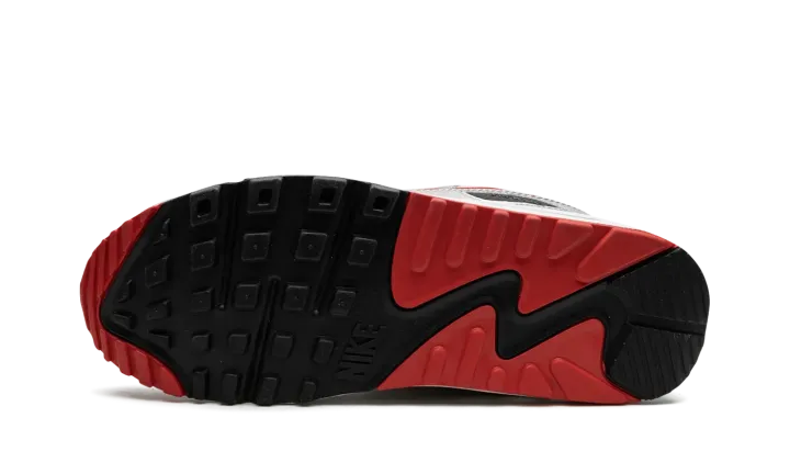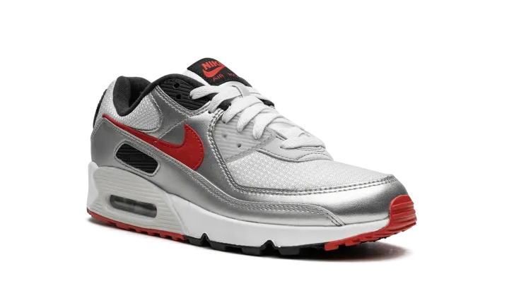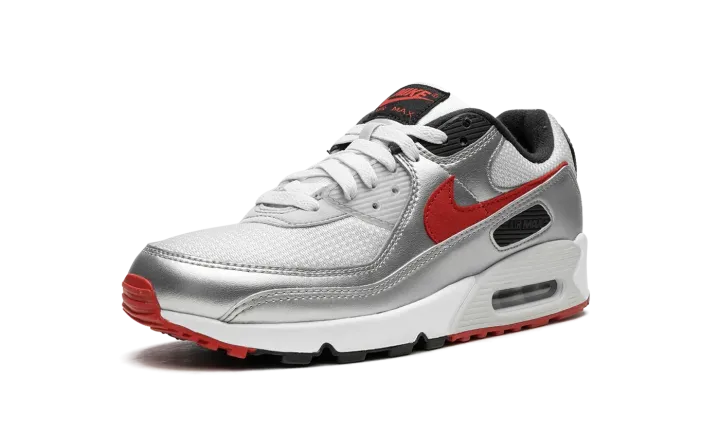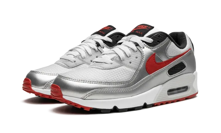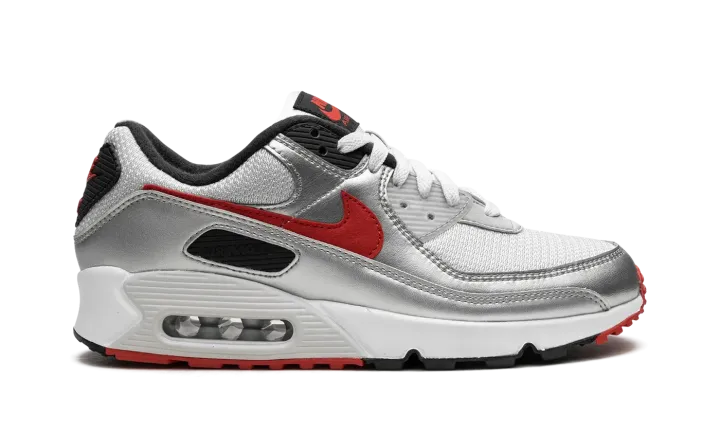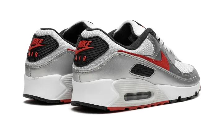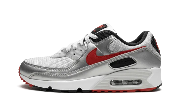 The Nike Air Max 90 "Icons - Silver Bullet" is a colorway of the retro running shoe inspired by the equally iconic Nike Air Max 97 of the same nickname. Celebrating its Air Max legacy, Nike dresses the Air Max 90 in a colorway reminiscent of the Air Max 97's "Silver Bullet" release from 1997. The sneaker has a white mesh base contrasted with Silver Metallic leather overlays. A fiery red Swoosh appears on the sides. Black "Air Max" branding is found within a branding window on the lateral side of the heel. Classic "Nike Air" detailing appears on the heel and on the tongue tag. A clear Air bubble in the heel of the white foam midsole completes the look. Release date: April 13, 2023