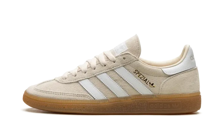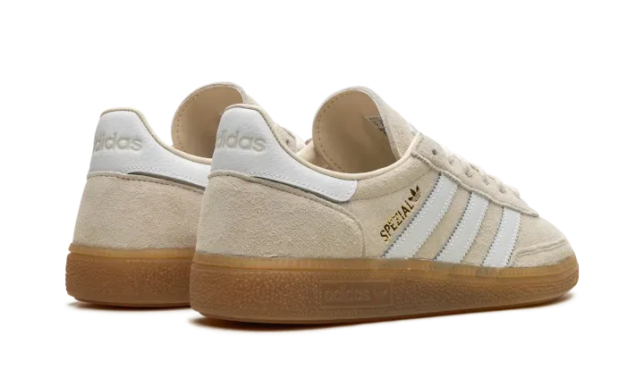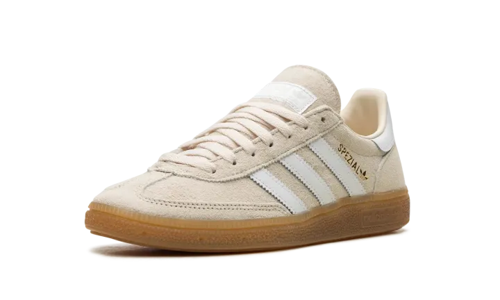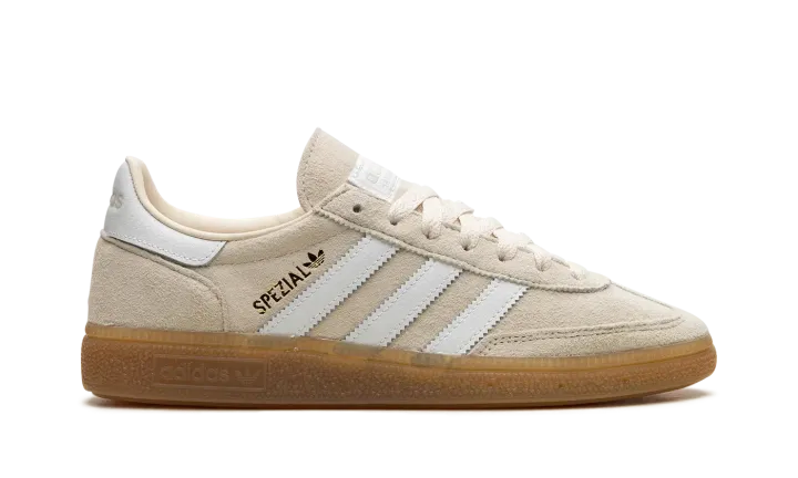 The adidas Handball Spezial "Wonder White" is an easy-to-style colorway of the timeless-looking sneaker. The upper is complete with a Wonder White suede construction and contrasted with white leather Three Stripes branding on the sides. Gold "Spezial" and adidas Trefoil logos appear on the lateral side of the mid-panel, while "adidas" branding appears on the white leather heel tab. A gum sole completes the look. Release date: December 27, 2023