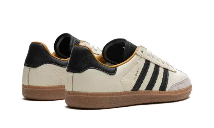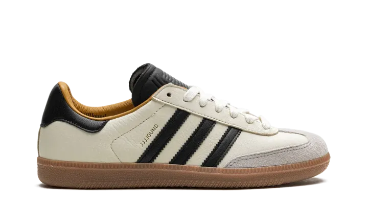 The JJJJound x adidas Samba OG "Off White/Core Black" is a collaboration by Justin Saunders' design studio and clothing brand on the retro sneaker. Following collaborations with the likes of New Balance, Vans, and other popular shoe companies, JJJJound joined forces with adidas in 2024 for a collection of Samba colorways, including this shoe. The upper is complete with an Off White leather base with grey suede on the toe. Core Black leather Three Stripes appear on the sides, while a gold "JJJJound" logo can be seen on the lateral side of the mid-panel. A gum rubber sole puts the finishing touches on the design. Release date: March 27, 2024