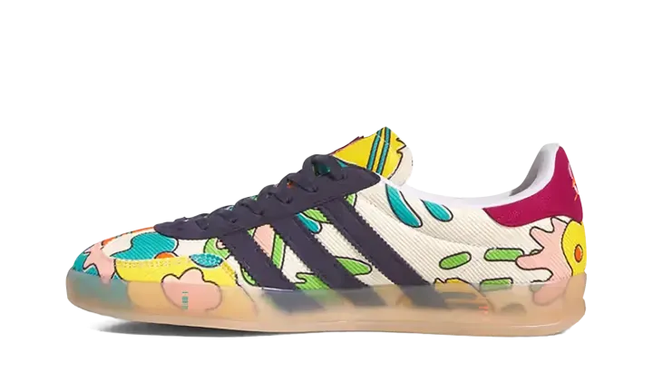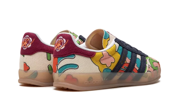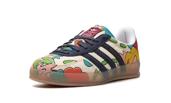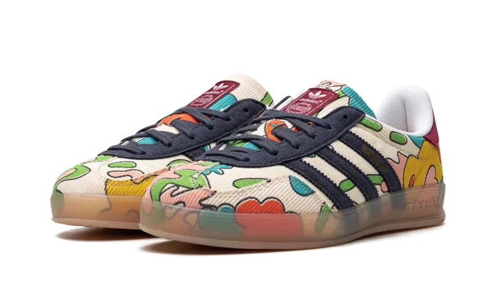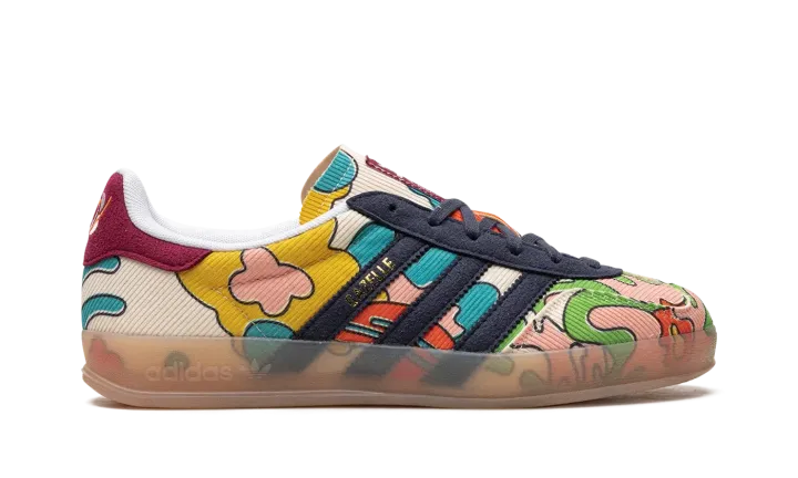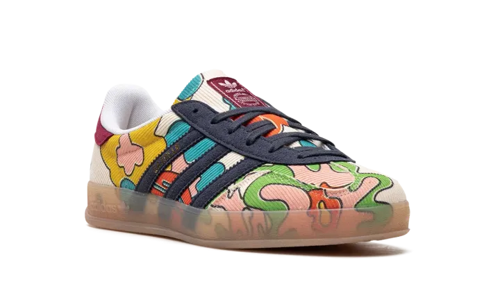 The Sean Wotherspoon x adidas Gazelle Indoor "Corduroy" is a collaboration between the vintage curator and sneaker designer and adidas on a unique version of the indoor soccer shoe. Sean Wotherspoon's adidas Gazelle Indoor is constructed of a mixture of sustainable materials per Wotherspoon's other collaborations with adidas. The shoe features a Sail corduroy upper with multicolor graphics on the side. Wotherspoon's signature branding is embroidered on the heel. Corduroy Three Stripes in navy are found on the side. A semi-translucent gum rubber sole rounds out the look. Release date: May 27, 2023