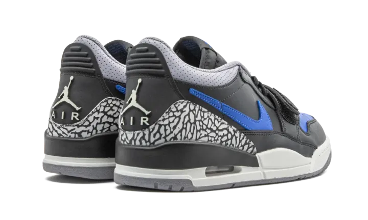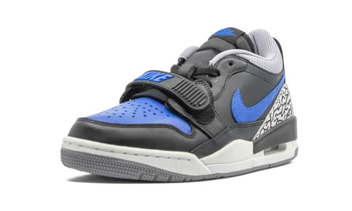 The Jordan Legacy 312 Low shoe design is derived from the expert mind of Don C, a longtime collaborator with Jordan Brand and Nike. Here, Don C combines signature elements of different Jordan models together for a fresh look. The upper consists of a black leather base with a royal blue perforated toe and black overlays on the forefoot, eyelets, and mudguard. A blue Swoosh sits on the mid-panel, while a black strap crosses the forefoot and provides lockdown support. Elephant print is located on the lateral panel as an ode to the timeless shoe, and a visible Air unit in the heel finishes the look.