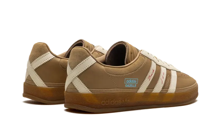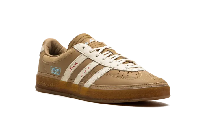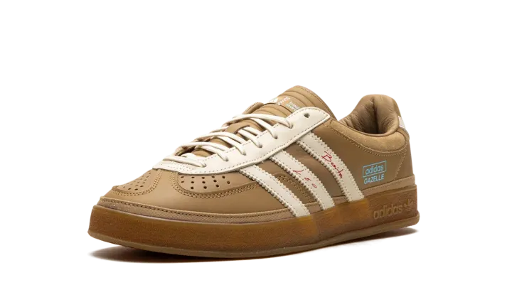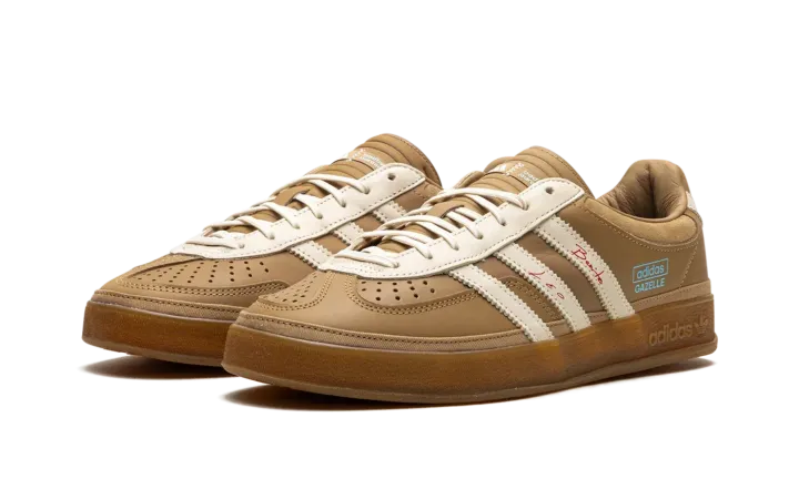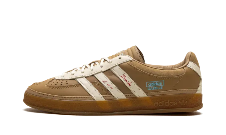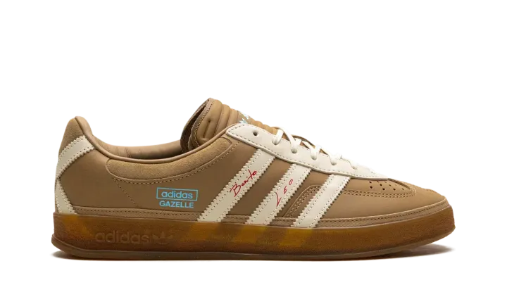 Watch music and soccer worlds collide with the Adidas Gazelle Indoor Bad Bunny x Lionel Messi 'Cardboard,' the ultimate "Icon Clash" sneaker. This premium edition features a rich, tan leather upper with soft suede overlays and a signature warped T-toe, nodding to Bad Bunny's unique aesthetic. Red "Benito" and "Leo" signatures adorn the iconic Three Stripes, while an "X" shape on the heel references Messi's jersey number 10. A translucent gum sole completes this collector's must-have.
