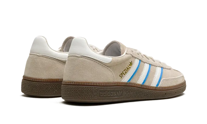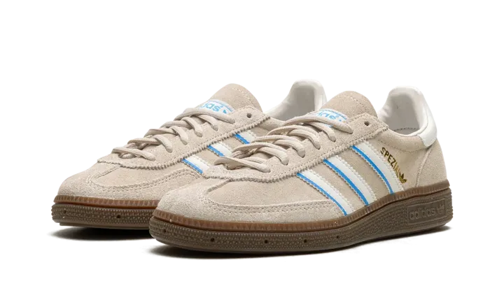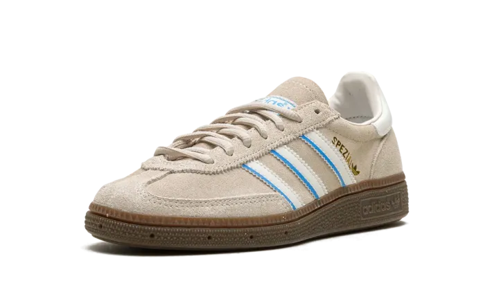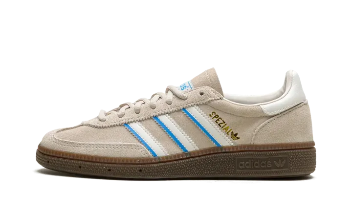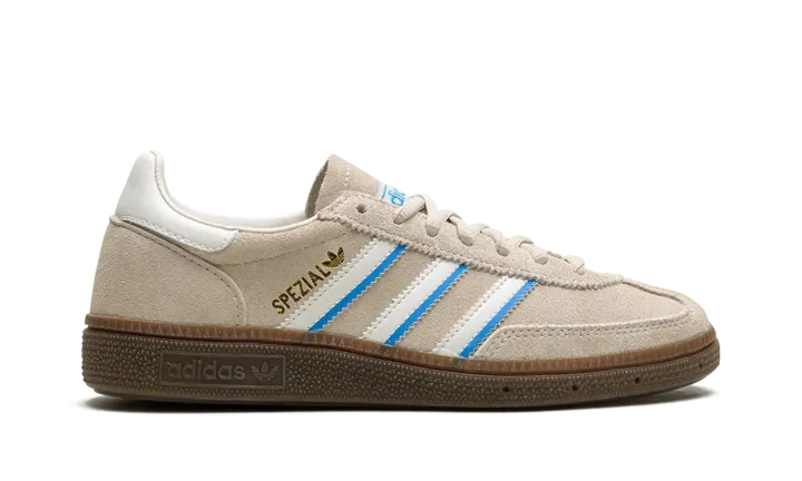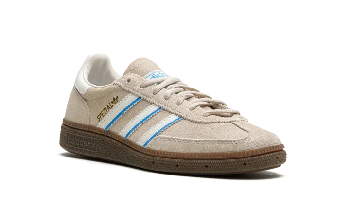 The adidas Handball Spezial "Aluminum" is a versatile, neutral colorway of the lifestyle shoe. The adidas Handball Spezial is a popular, casual sneaker with a versatile silhouette. On this colorway, the shoe features an Aluminum suede upper with Cloud White leather Three Stripes on the sides accented with blue. A gold "Spezial" logo is printed on the lateral side of the mid-panel. Cloud White accenting can be found on the leather heel tab, laces, and on the tongue tag featuring blue "adidas" detailing. A dark gum rubber sole completes the look.