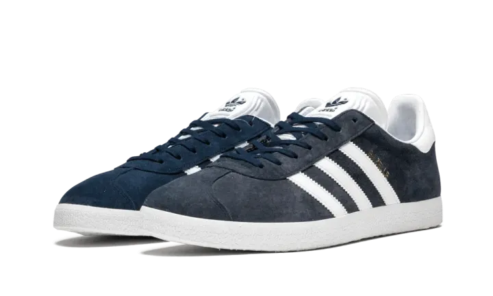 The adidas Gazelle "Navy" is a navy-based colorway of the classic low-top sneaker. The adidas Gazelle is one of the footwear brand's most essential sneakers and, especially in the "Navy" colorway, one of its most versatile. The shoe features a navy blue suede construction with white leather Three Stripes branding on the sides. A white printed "Gazelle" logo is seen on the lateral side. Adidas TreFoil branding is located on the heel and on the tongue. An all-white rubber sole unit completes the look.