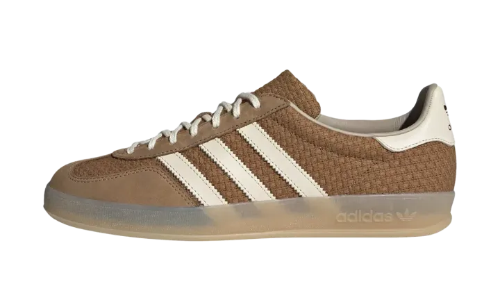 Slip into a classic with the Adidas Gazelle Indoor "Brown Desert / Wonder White." This iconic lifestyle shoe brings a fresh, earthy twist to the beloved silhouette, featuring rich Brown Desert suede paired with crisp Wonder White accents on the signature Three Stripes. The defining feature is the slightly translucent, gum-colored sole, which provides excellent grip and a vintage touch. Perfect for adding a sophisticated, retro vibe to your everyday casual wear.