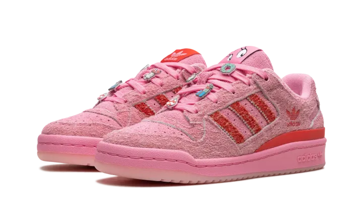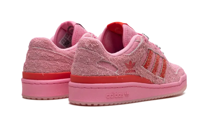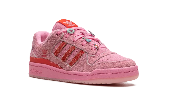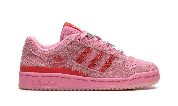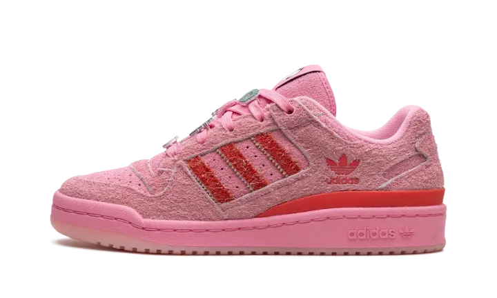 The adidas Forum Low "The Grinch - Cindy Lou Who" is a colorway of the classic basketball shoe inspired by the Dr. Seuss character of the same name from the children's book and animated Christmas special, "The Grinch." One of three colorways from a collaboration between Dr. Seuss and adidas, the "Cindy Lou Who" is inspired by the young girl who catches The Grinch stealing her family's Christmas tree when getting a glass of water during the night. The upper features a hairy pink suede appearance with bright red suede Three Stripes branding. Detailing inspired by Cindy Lou Who can be found on the tongue and insole. Lace dubraes also inspired by Cindy Lou Who appear on the laces.