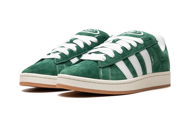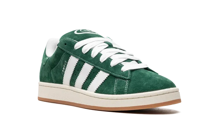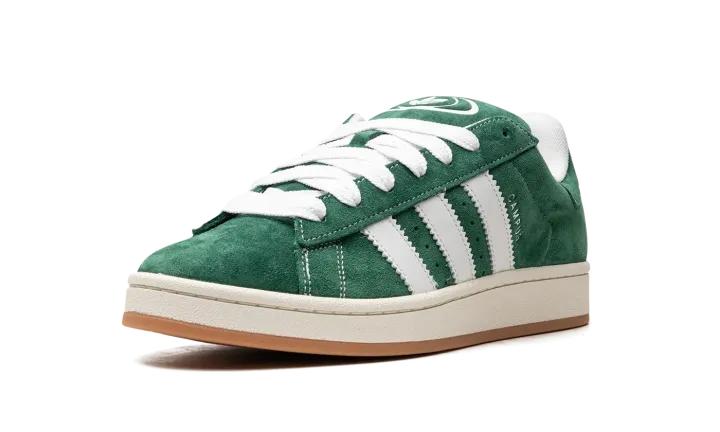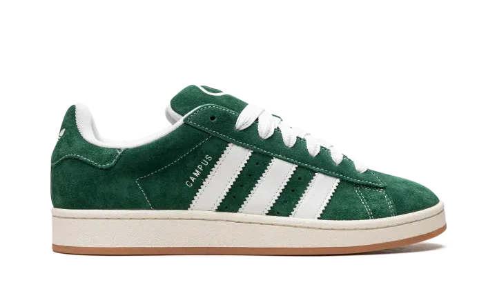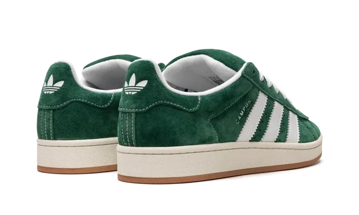 The adidas Campus 00s "Dark Green" is a colorway of the classic shoe with a skate-inspired vibe. The adidas Campus 00s is a retro shoe with a design inspired by Y2K-era skate shoes. On the "Dark Green," the model features a green suede appearance with white contrast stitching on each overlay. Oversized white leather Three Stripes on the sides. "Campus" branding is seen on the lateral side of the mid-panel next to the classic adidas logo detailing. The brand's signature Trefoil logo appears on the heel and on the tongue in white. The shoe's off-white midsole is mounted on a gum rubber outsole with a herringbone pattern that provides ample grip whether on or off a skateboard. Release date: March 15, 2023