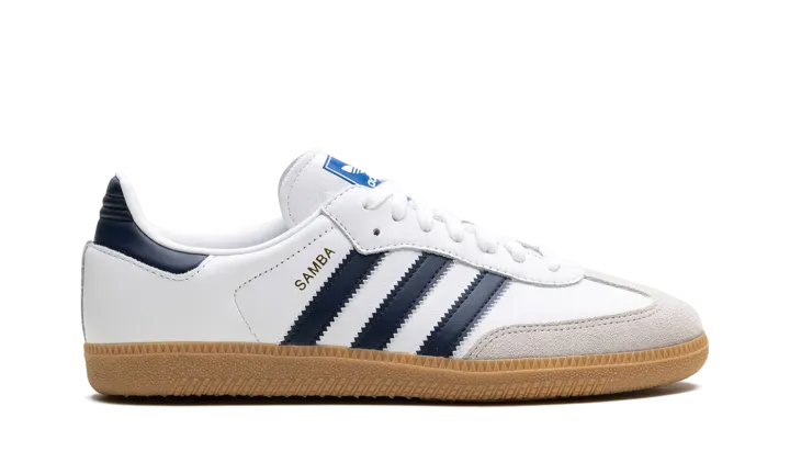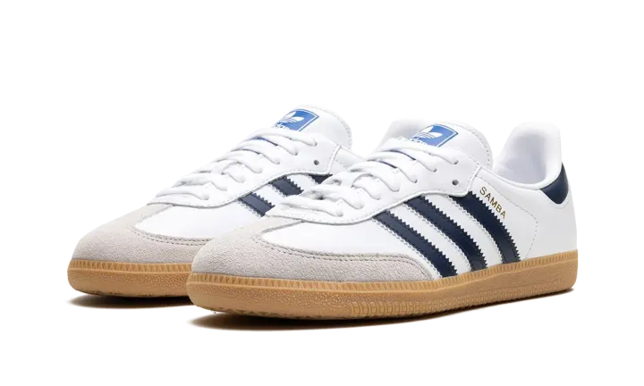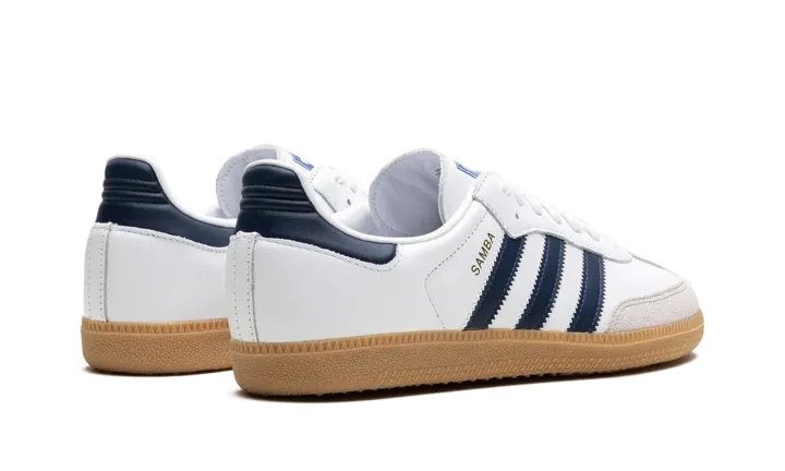 The adidas Samba OG "White/Night Indigo" is a colorway of the retro shoe with navy accents. The adidas Samba OG is one of the most popular sneakers in the world due to its versatility and comfort. Here, the "White/Night Indigo" features a white leather base and a grey suede overlay on the toe. The Three Stripes branding on the sides appears in a Night Indigo tone, while a gold foil "Samba" logo can be seen on the lateral side of the mid-panel. Classic adidas Samba detailing is printed on the tongue. A gum rubber sole completes the look.
