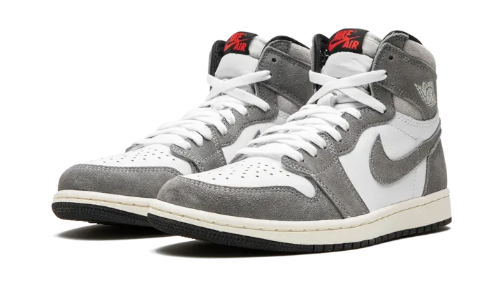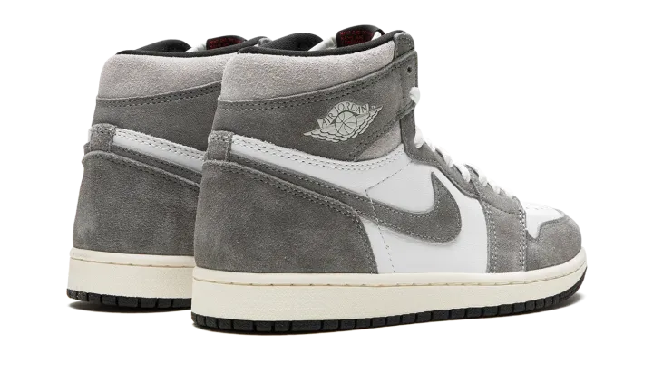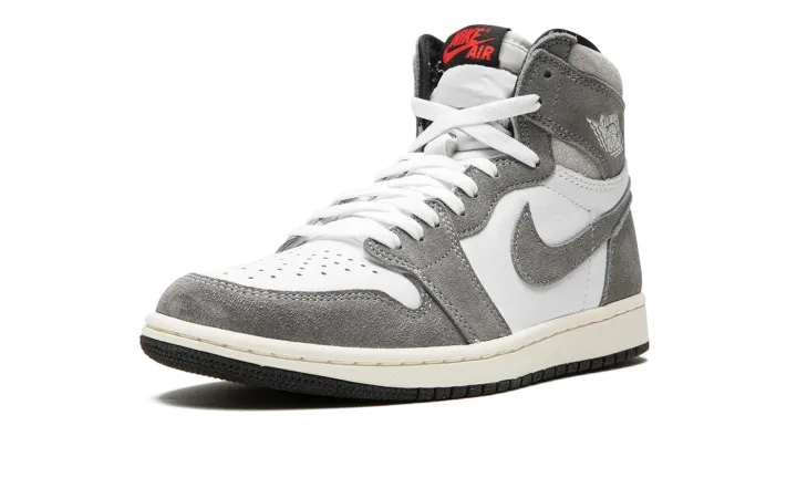 The Air Jordan 1 High OG "Washed Black" is a colorway of the retro basketball shoe with washed black suede overlays. The "Washed Black" Jordan 1 High OG features a versatile look due to its white leather base and faded black suede overlays and Swoosh branding on the side. A "Wings" logo appears on the collar and "Nike Air" detailing is found on the tongue tag. The shoe's cream-colored midsole gives the design an aged, vintage look. Release date: June 10, 2023