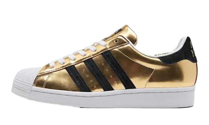 The Superstar 50TH ANNIVERSARY 'Liquid Gold' shoe celebrates five decades of iconic style with a dazzling liquid gold finish, offering a luxurious and commemorative take on the classic Superstar silhouette.