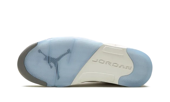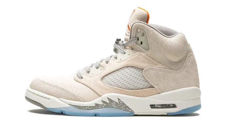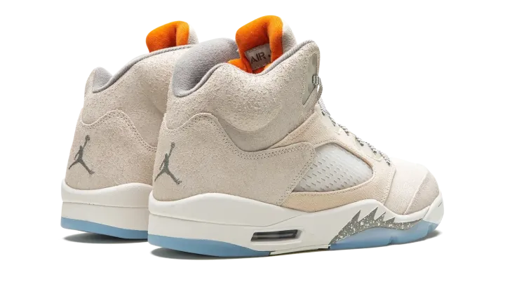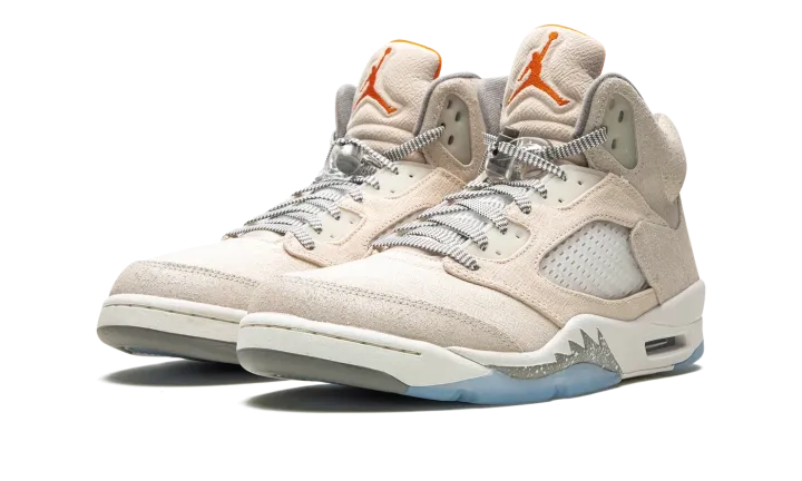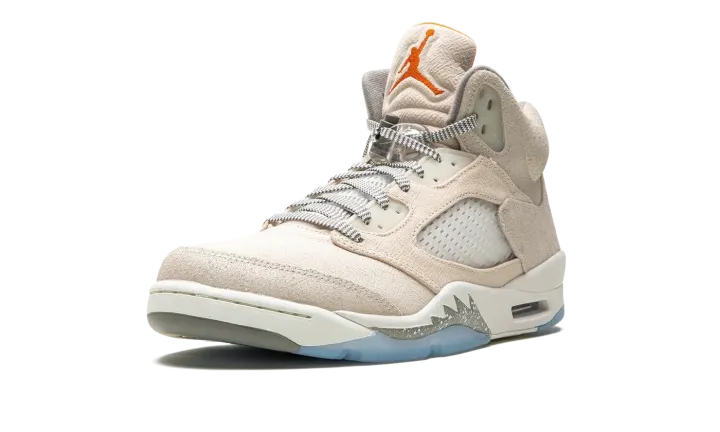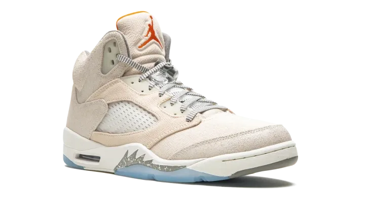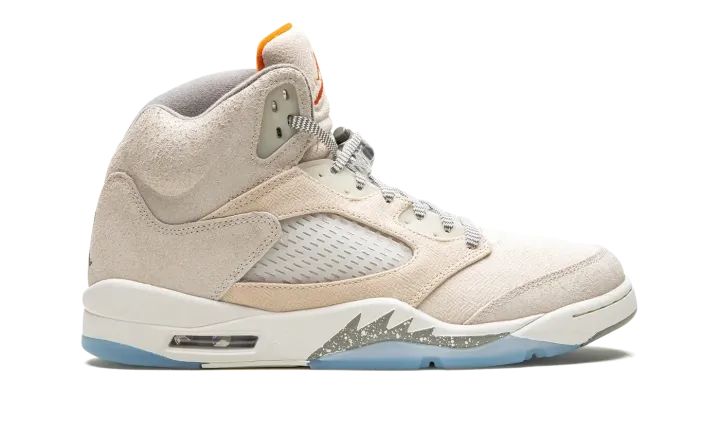 The Air Jordan 5 "Craft" is a modified version of the retro basketball shoe made from an interesting combination of materials that give it a lifestyle-focused design. Part of a greater collection of "Craft" sneakers, the Jordan 5 Craft features a Taupe-colored suede and textile construction with translucent netting on the mid-panel and tongue. An orange textile on the underside of the tongue matches the embroidered orange Jumpman on the tongue's front. Tonal Jumpman detailing is also found on the heel. Underfoot, grey shark tooth detailing with white speckling and an icy blue translucent outsole round out the premium look. Release date: June 17, 2023