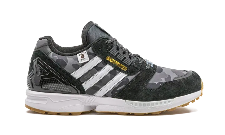 The BAPE x Undefeated x adidas ZX 8000 "Black" is part of a three-way Winter 2020 collaboration between the Japan based streetwear brand, Undefeated, and adidas. A joining of streetwear mega powers, BAPE, Undefeated, and adidas have collaborated together in the past to much success. Supple black suede overlays appear on the forefoot, eyelets, and heel counter. BAPE's iconic First Camo print in grey and black can be found on the toe, mid-panel, and collar. Luxurious gold foil "A Bathing Ape" branding is located on the overlay beneath the eyelets and white leather Three Stripes detailing can be found on either side. Additional branding appears in the form of a dual branded Undefeated and BAPE hang tag on the collar and mismatching Undefeated and BAPE branding appears on the right and left tongue tag, respectively. The brand's logos are embroidered on the heel, as well. The white midsole is contrasted by a classic gum bottom to complete the look. Release date: November 20, 2020
