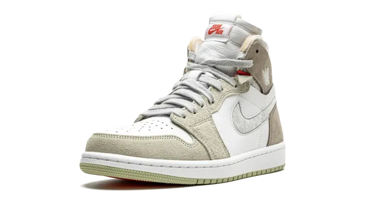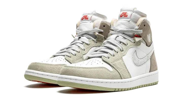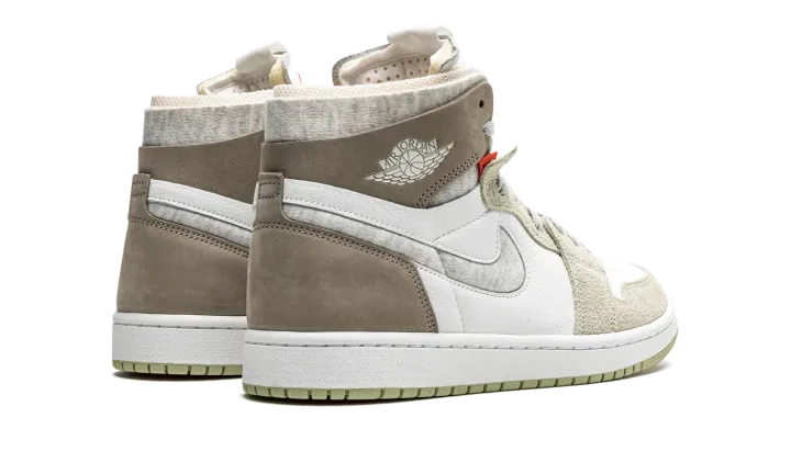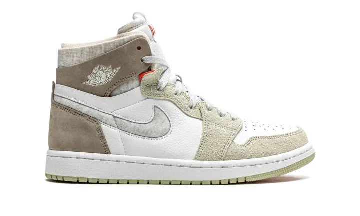 The Women's Air Jordan 1 High Zoom CMFT "Olive Aura" is a women's-exclusive colorway of the alternate, modernized version of the retro basketball shoe that includes even more padding than the standard edition. The Zoom Comfort version of the Air Jordan 1 displays a deconstructed look similar to the Off-White x Air Jordan 1 from "The 10" collection from 2017. The upper is constructed with a white leather base with grey hairy suede panels on the toe cap, forefoot, and eyelets. Olive nubuck is found on the heel and collar and a marbled grey Swoosh appears on both sides. A white "wings" logo can be found on the collar. On the tongue, "Zoom Air" branding replaces the standard "Nike Air" detailing found on the original Air Jordan 1. The modified branding symbolizes the Zoom Air cushioning utilized within the midsole.