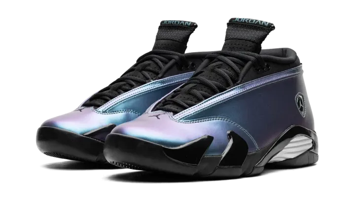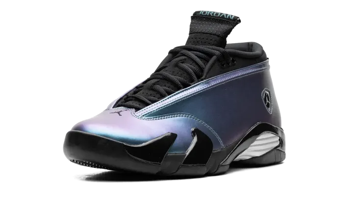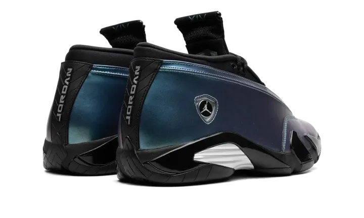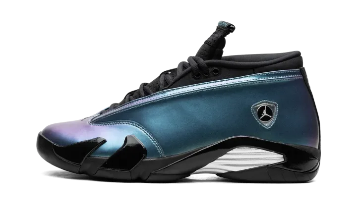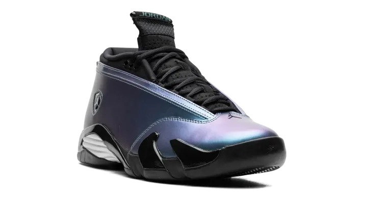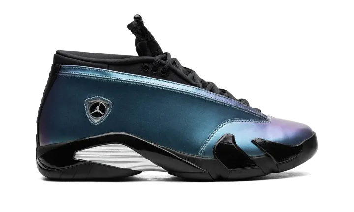 The Women's Air Jordan 14 Low "Mineral Teal" is a women's-exclusive colorway of Michael Jordan's fourteenth signature shoe with an eye-catching iridescent appearance. The Jordan 14 Low is the alternate low-top version of the retro basketball sneaker that was worn by Jordan during his final game with the Chicago Bulls. Here, the shoe features an iridescent synthetic leather upper in shades of blue and purple with a classic Ferrari-inspired Jumpman emblem on the side in chrome. "Jordan" branding is seen on both the heel and tongue. A midfoot shank plate and white rubber sole complete the bold look. Release date: March 2, 2024